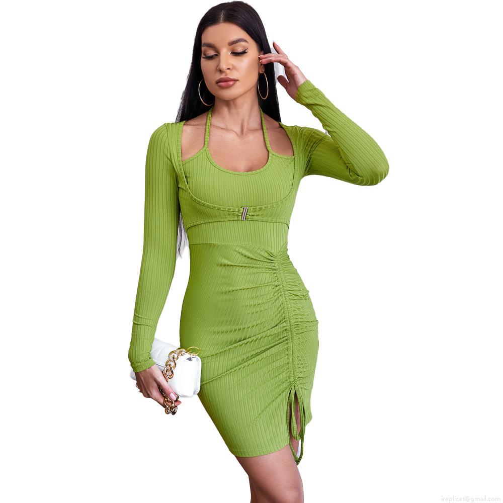 • Women's Ribbed Knit Bodycon Mini Dress Long Sleeve Mock Two Piece Halter Cut Out Ruched Drawstring Side Slit Slim Fit Short Dress For Casual Party