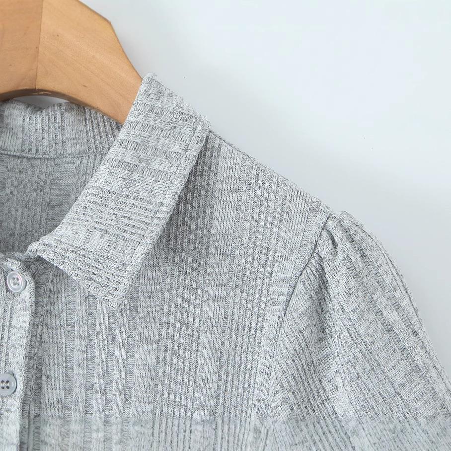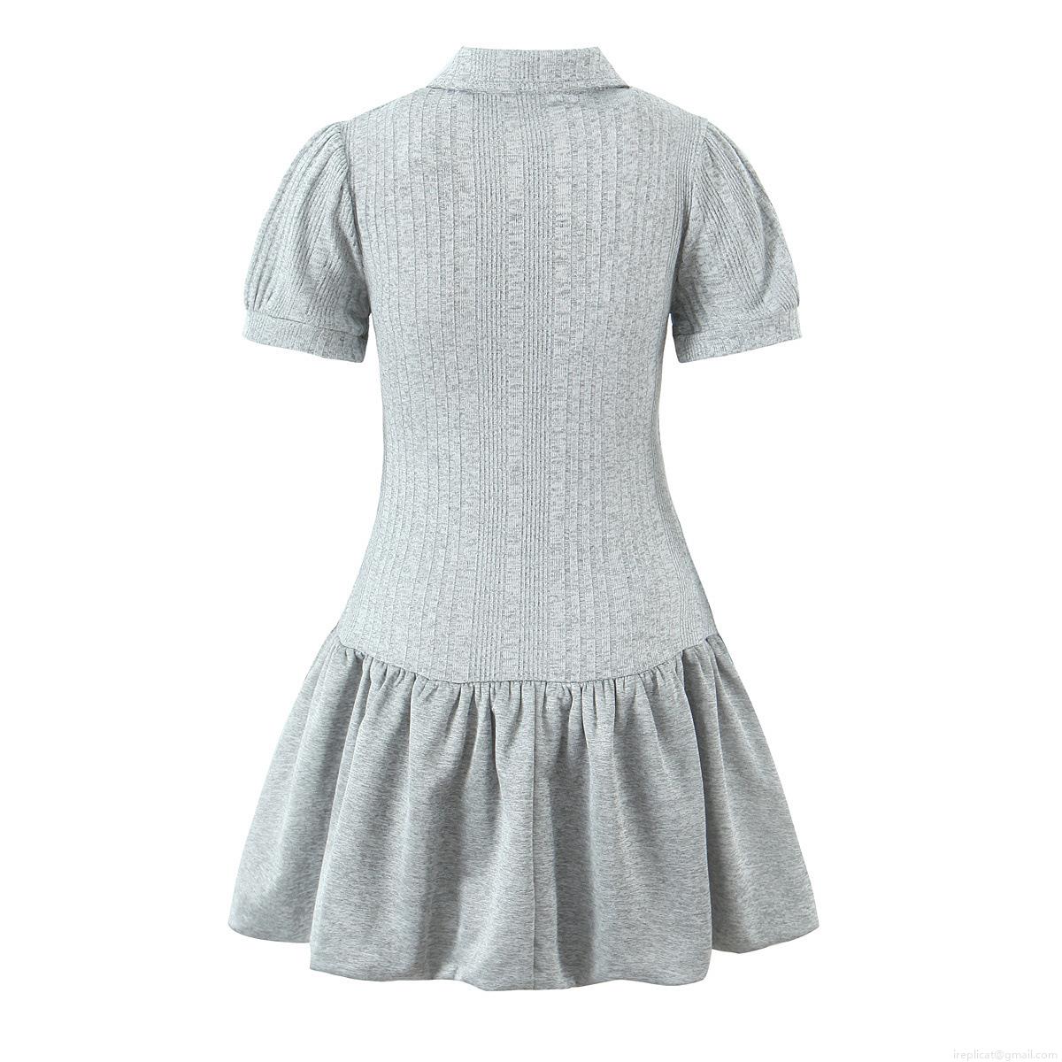 • Women's Ribbed Knit Mini Dress Short Sleeve Puff Sleeve Polo Collar Button Up Front Ruffle Hem Slim Fit Sweet Academy Style Casual Short Dress For Ladies Grey
