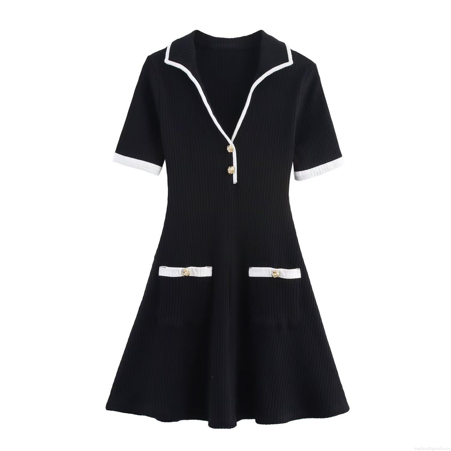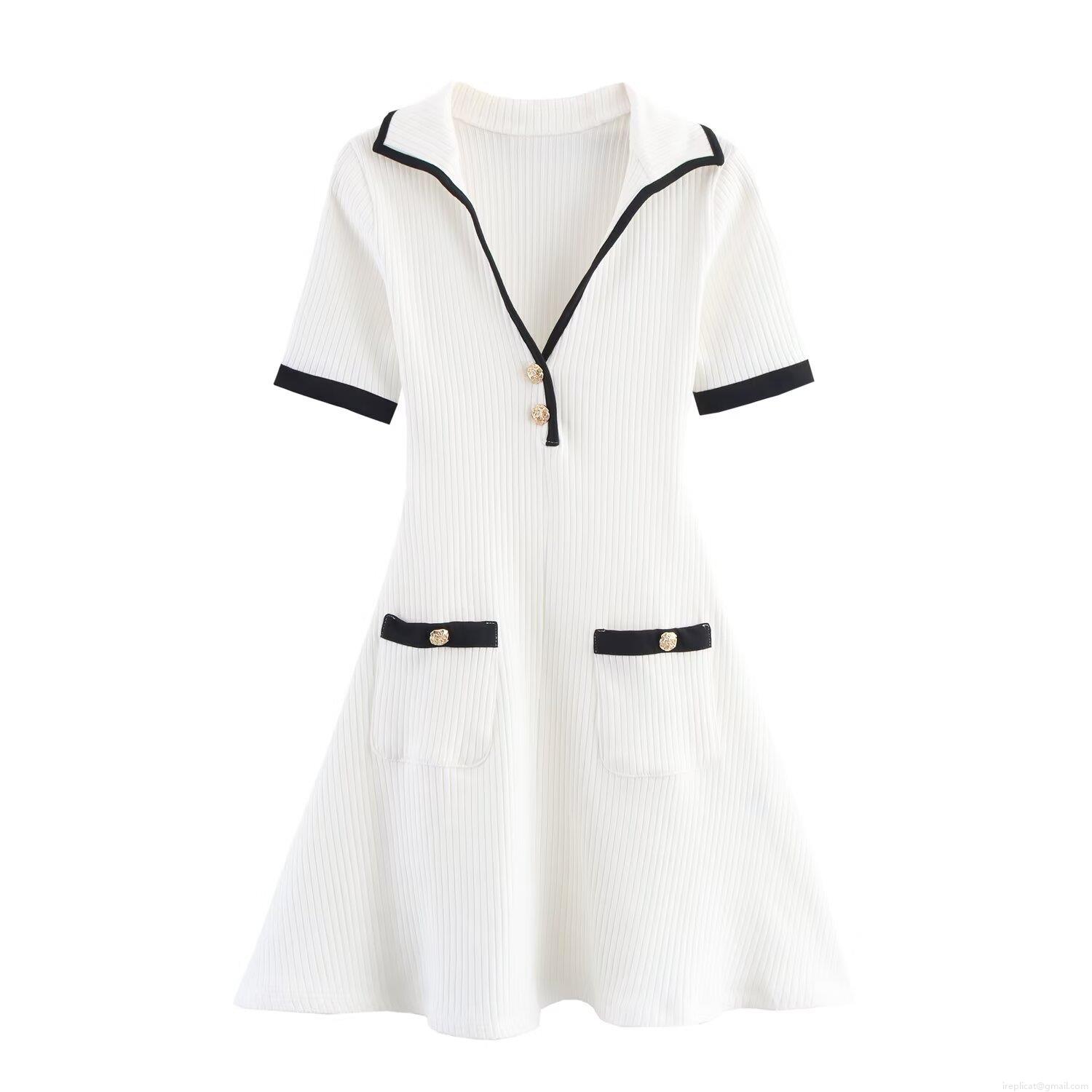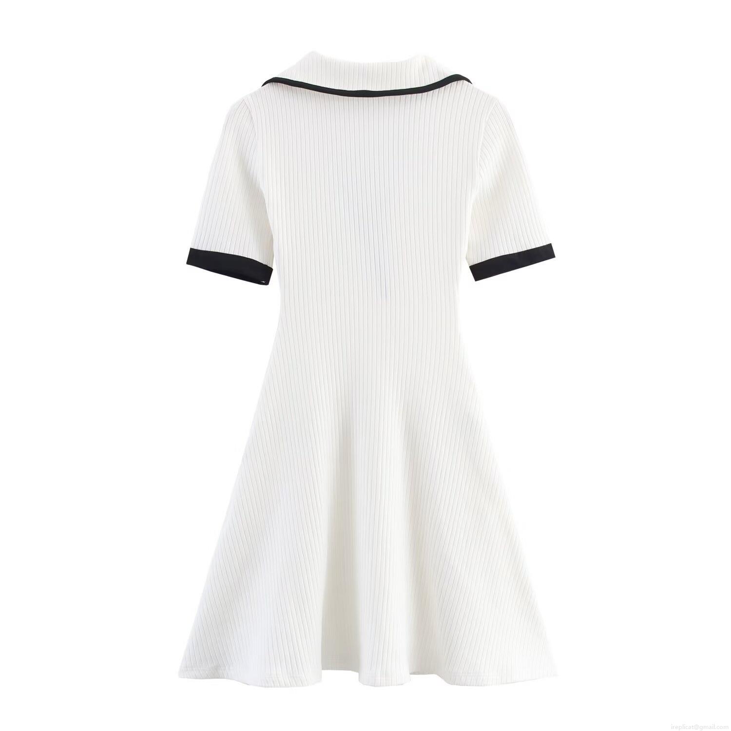 • Women's Ribbed Knit Short Sleeve Mini Dress Elegant Contrast Trim V-Neck Polo Dress With Metal Buttons A-Line Casual Party Slim Fit Dress