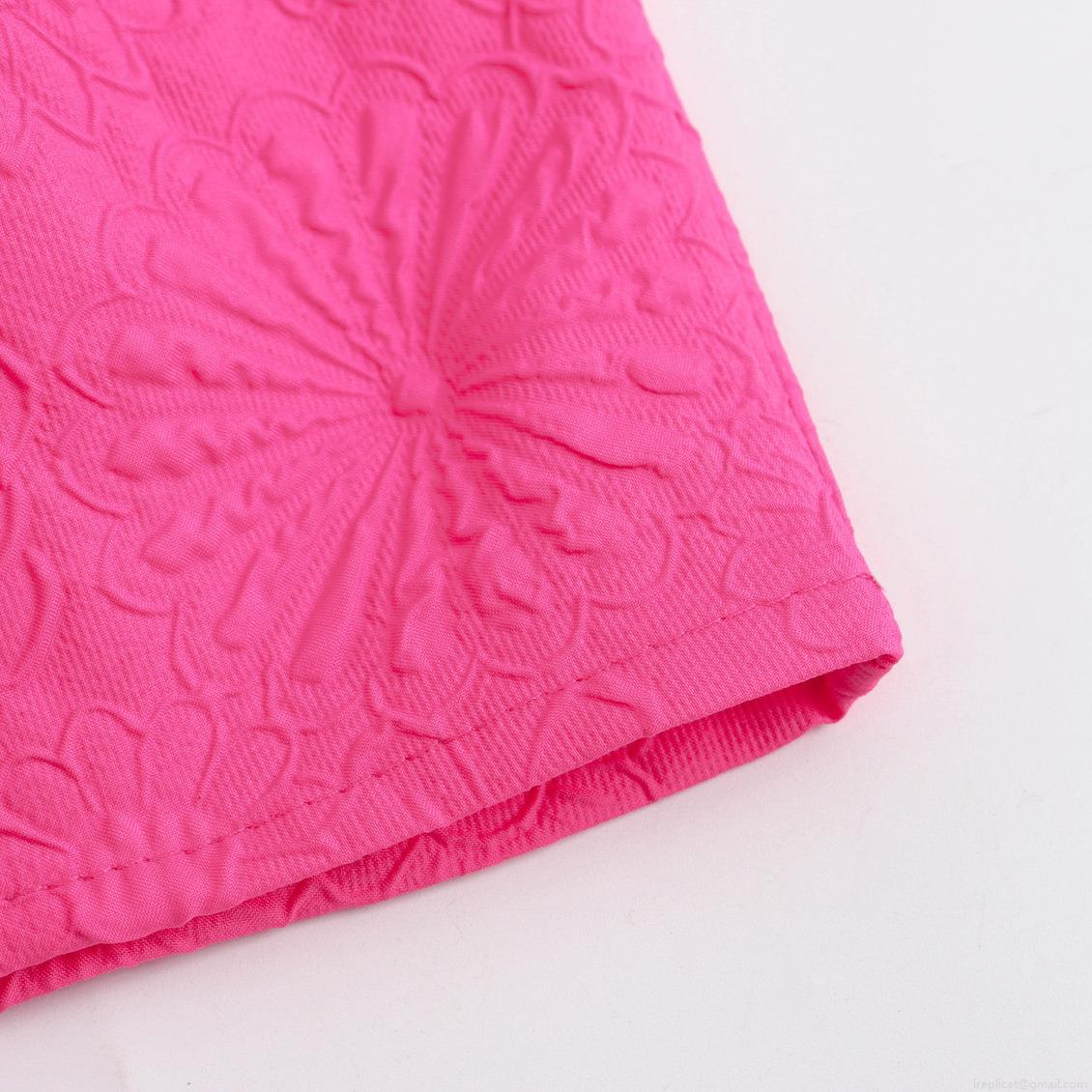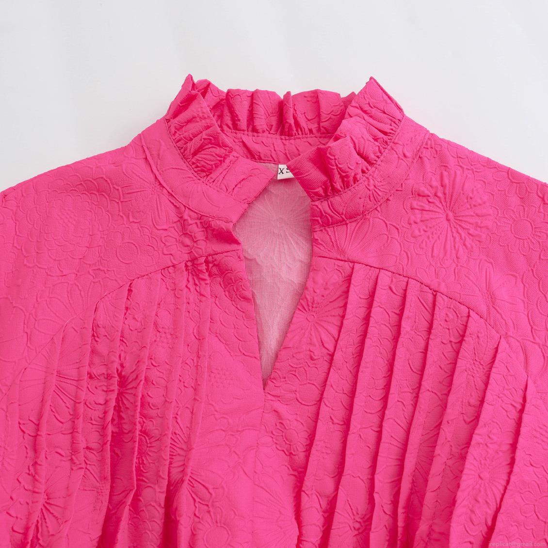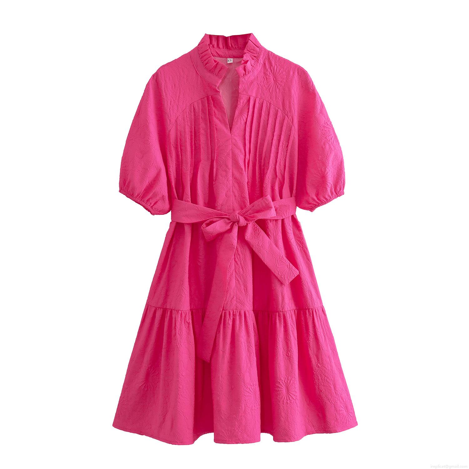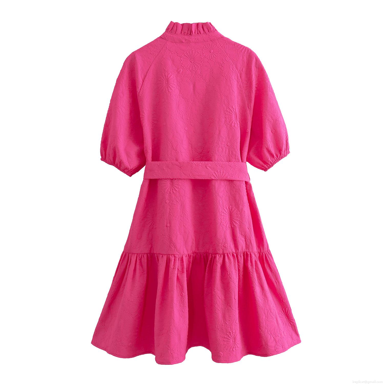 • Women's Rose Red Polyester Floral Embossed Mini Dress Ruffle Stand Collar Short Puff Sleeve A-Line Tiered Cake Dress With Belt For Summer Vacation Party
