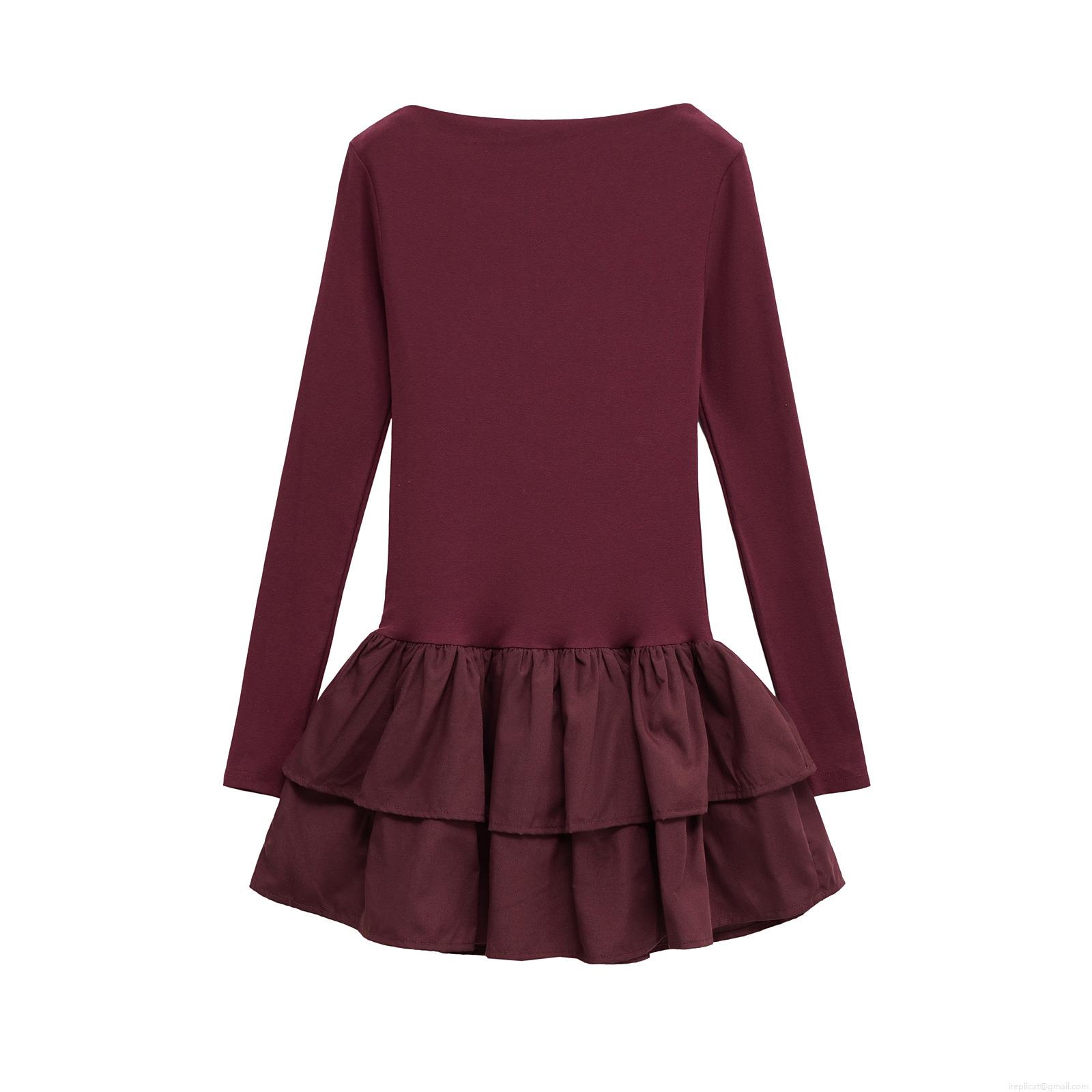 Women's Round Neck Tiered Ruffle Mini Dress Cotton Blend Long Sleeve Solid Wine Red European Streetwear Fashion Short Party Dress for Women