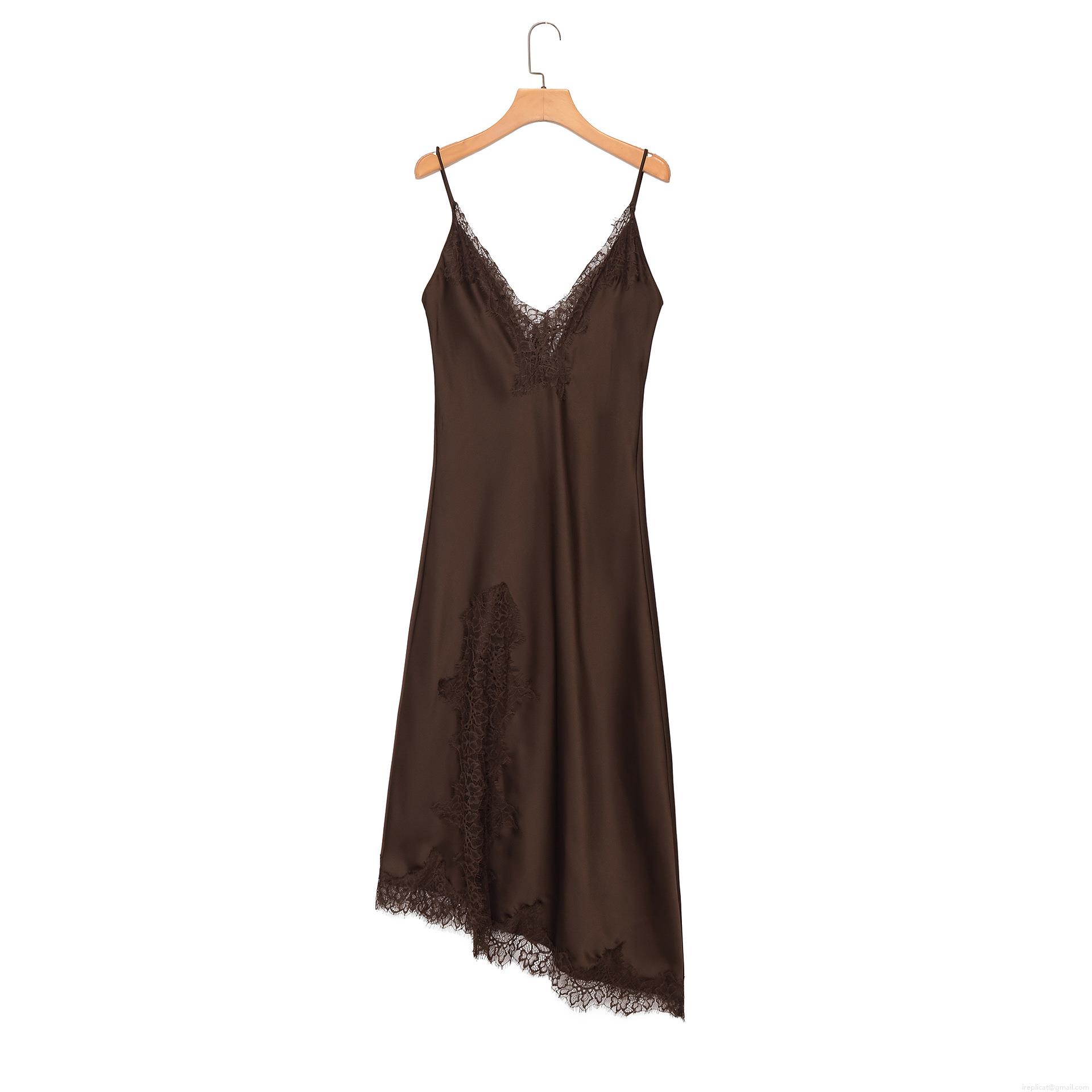 • Women's Satin Lace Trim Cami Dress Sexy V Neck Asymmetrical Hem Mini Dress For Party Evening Club Elegant Solid Coffee Brown Sleeveless Slip Dress