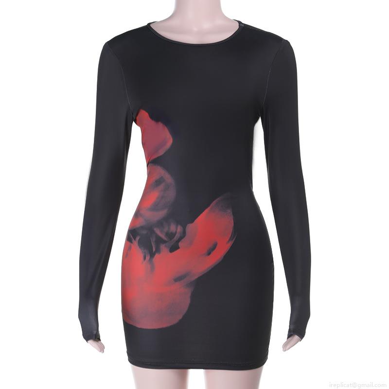 • Women's Sexy Backless Bodycon Mini Dress Long Sleeve Crew Neck Abstract Red Print Streetwear Clubwear Night Out Party Dress Polyester Spandex Slim Fit