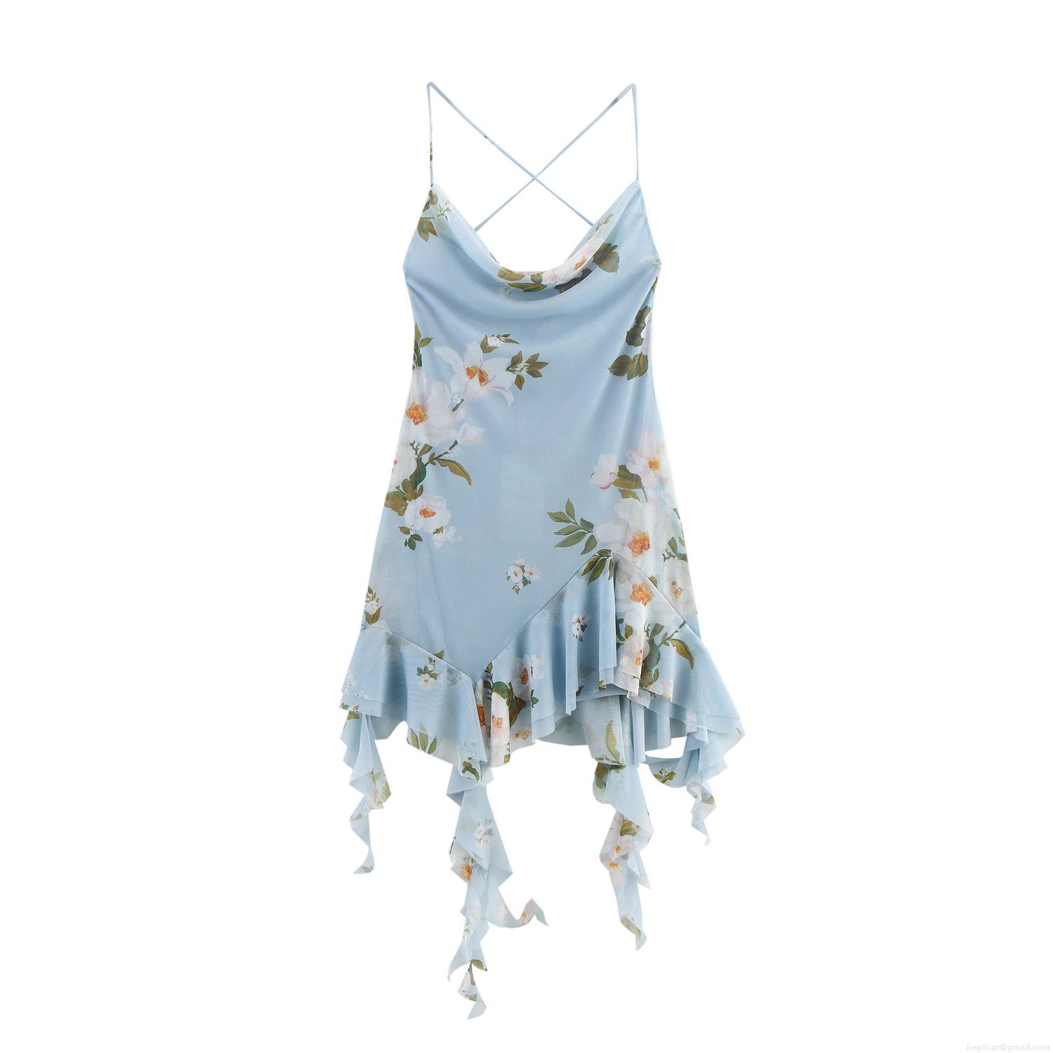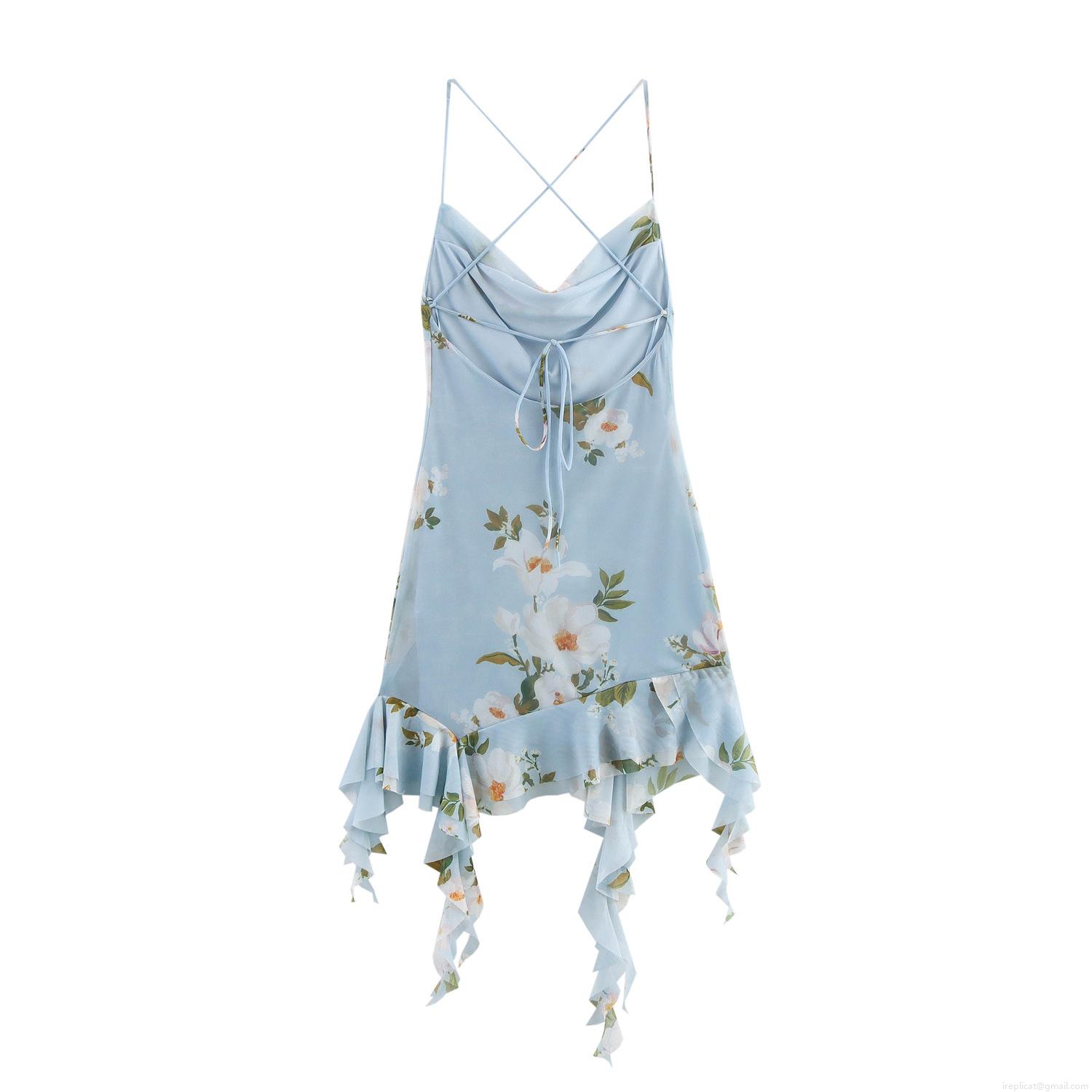 • Women's Sexy Backless Floral Camisole Mini Dress Cowl Neck Ruffle Hem Sleeveless Summer Vacation Sundress Light Blue Mesh Floral Dress
