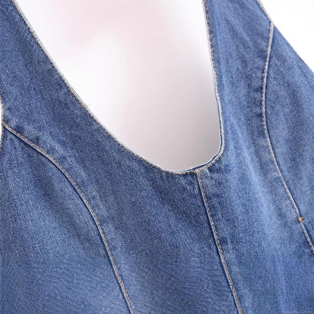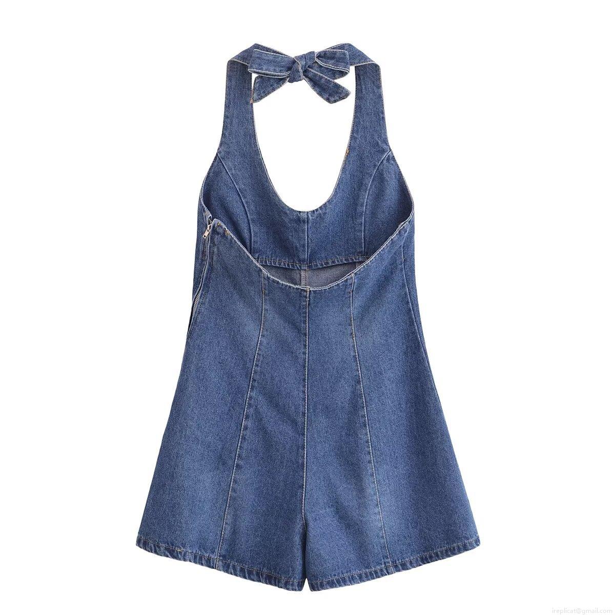 • Women's Sexy Backless Halter Denim Mini Dress V-Neck Bow Tie Waist Summer Sleeveless Jean Dress For Party Clubwear Vacation Romper