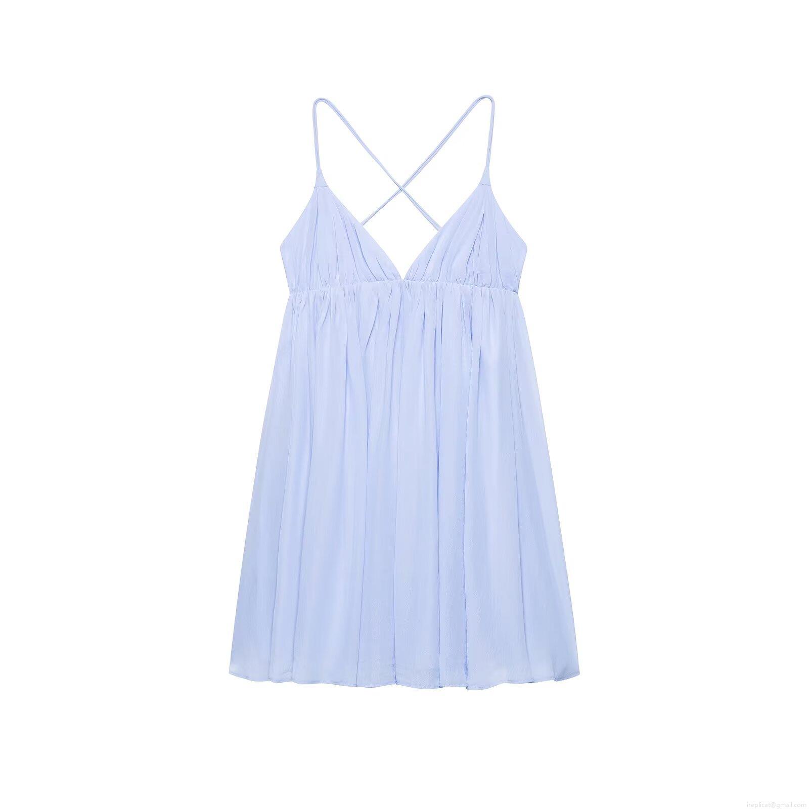 Solid Color, V-neck, Cross Straps, Pleated Decoration, Backless Design
