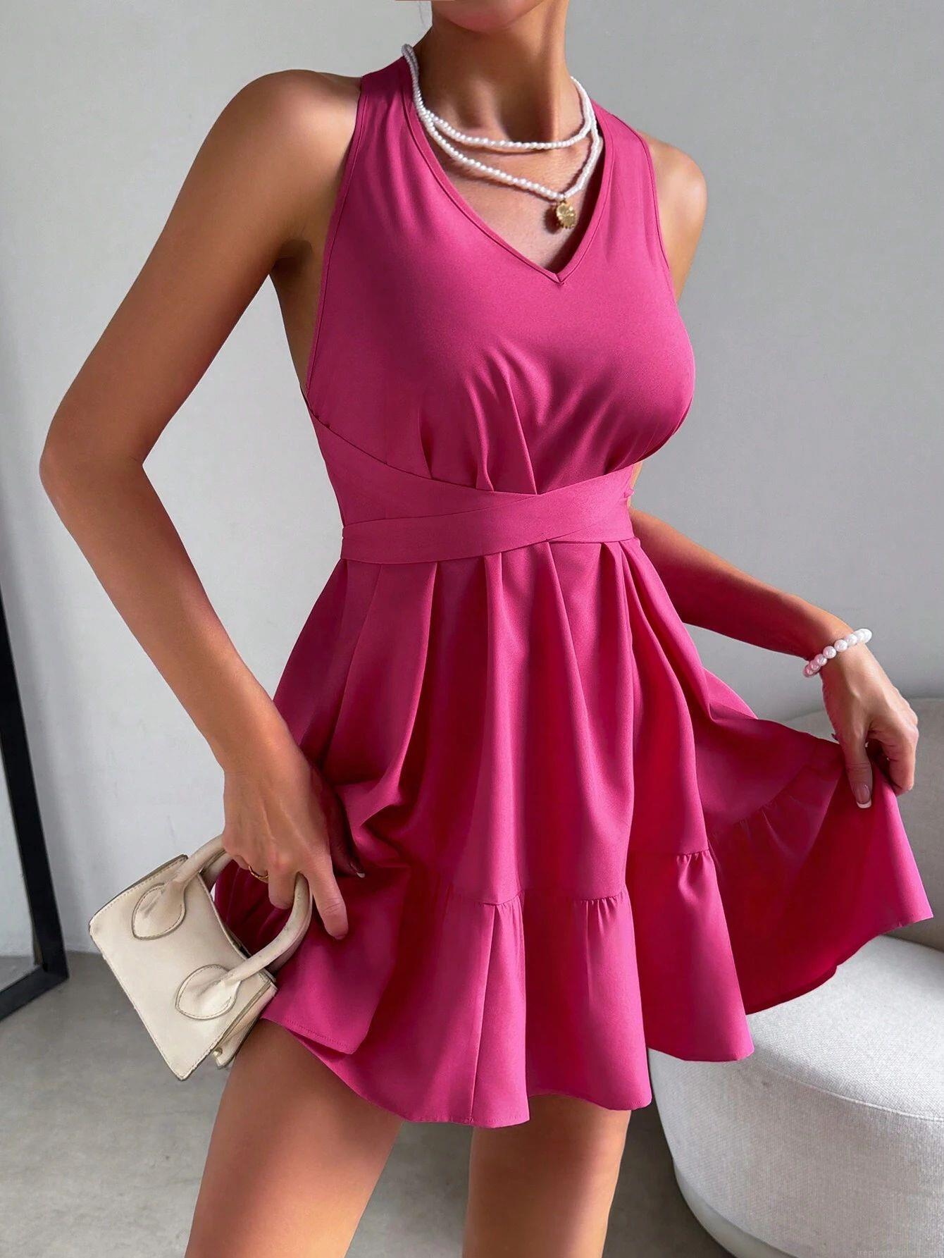 • Women's Sexy Backless Halter Neck Mini Dress High Waist Ruffle A-Line Summer Party Dress 100% Polyester Sleeveless Solid Color Magenta Sundress
