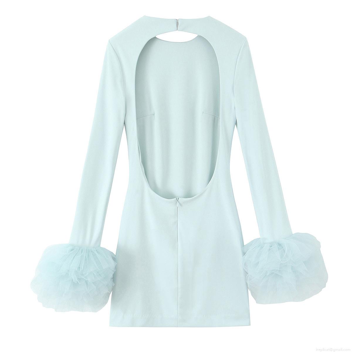 • Women's Sexy Backless Light Blue Mini Dress With Puffy Mesh Cuffs Elegant Solid Color Long Sleeve A-Line Short Dress For Party Dating