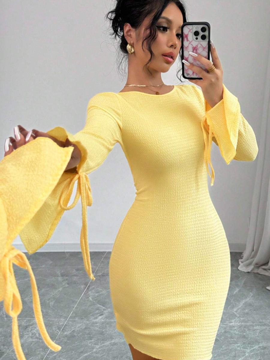 • Women's Sexy Backless Long Flare Sleeve Mini Dress Solid Yellow Textured Knit Bodycon Clubwear Party Evening Dress Slim Fit Tie-Up Robe