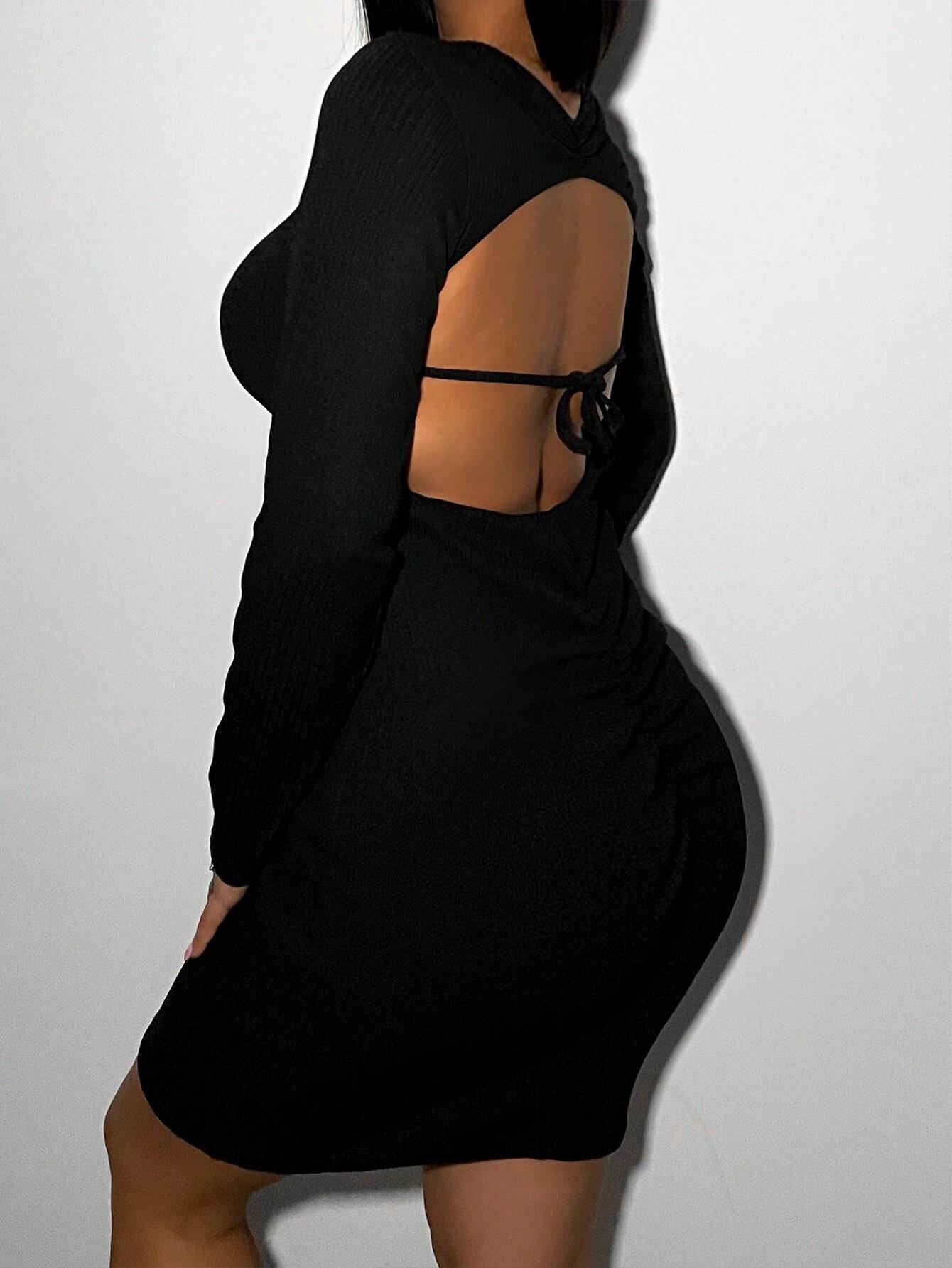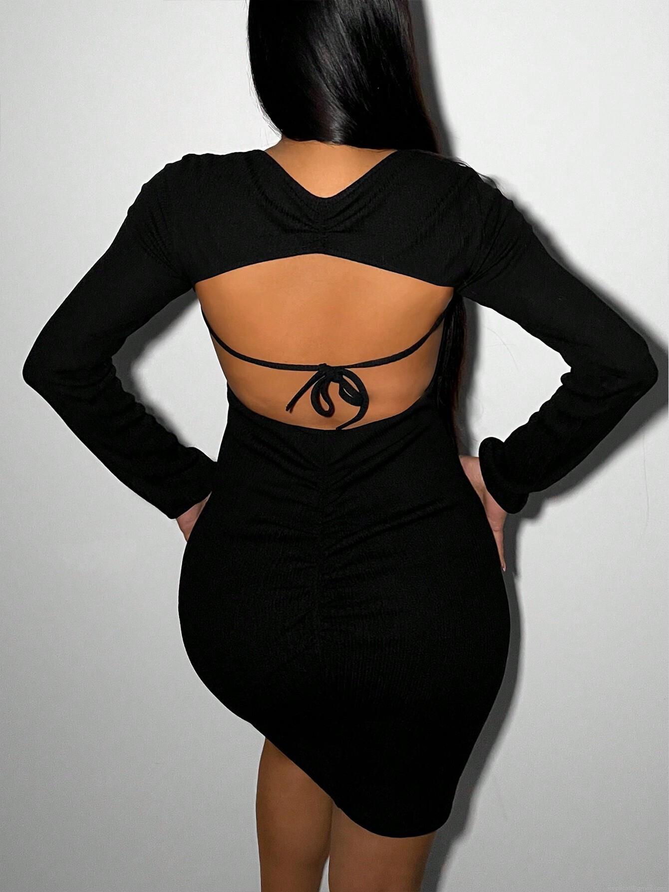 • Women's Sexy Backless Ribbed Knit Bodycon Mini Dress Long Sleeve Solid Color Lace Up Party Club Dress
