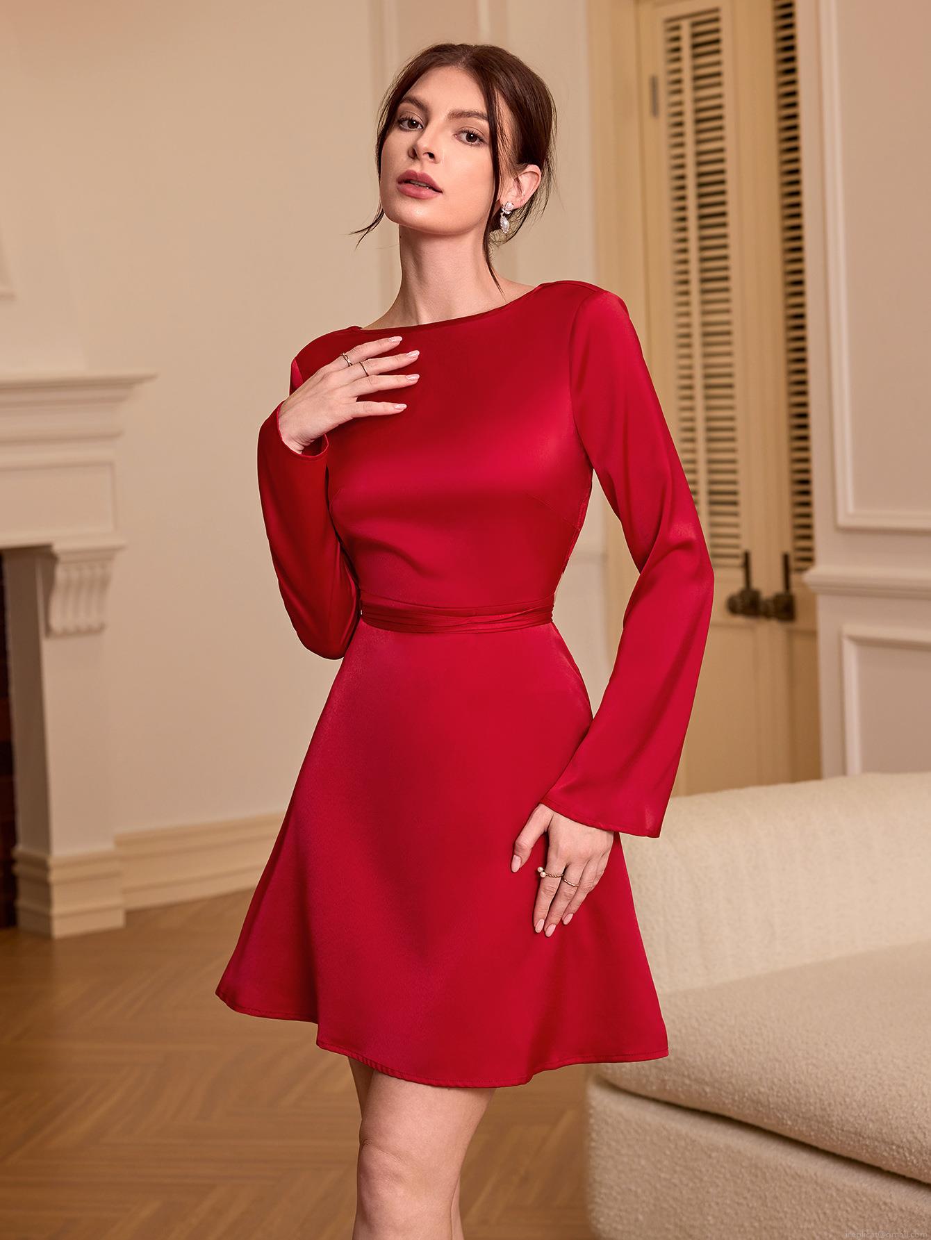 • Women's Sexy Backless Satin Long Sleeve Mini Dress Elegant High Waist Slim Fit Solid Color A-Line Short Dress For Party Cocktail Wedding Guest