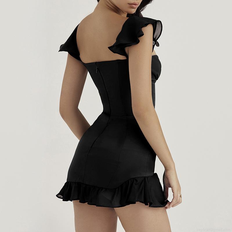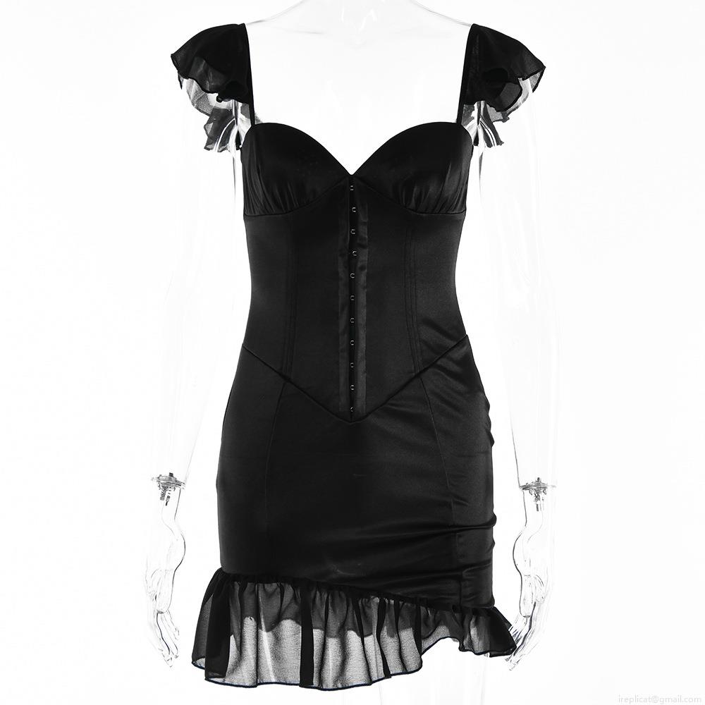 • Women's Sexy Backless Satin Ruffle Mini Dress Off-Shoulder Low Cut Corset Bodycon Pullover Short Party Club Camisole Dress