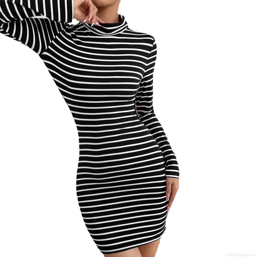 • Women's Sexy Backless Striped Bodycon Mini Dress Knitting High Neck Long Sleeve Tight Pencil Dress for Party Club Autumn Winter Fashion