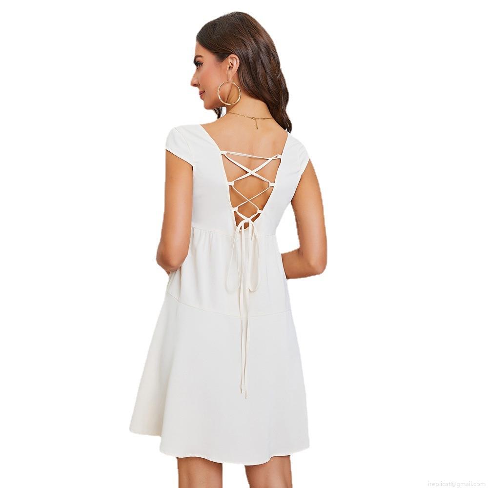 • Women's Sexy Backless Tiered Mini Dress 100% Polyester U-Neck High Waist Tie Back Summer Short Sleeve Cake Dress For Party Club Vacation