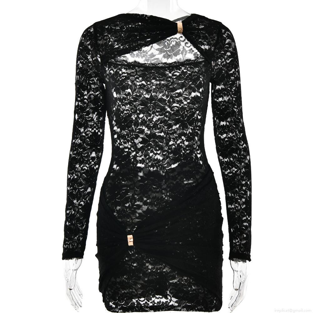 • Women's Sexy Black Lace Cut-Out Bodycon Dress With Metal Buckle Long Sleeve Mini Dress Elegant Slim Fit Clubwear Night Out Party Dress