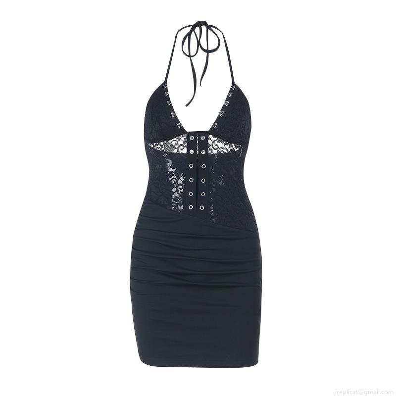 • Women's Sexy Black Lace Patchwork Halter Mini Dress V-Neck Backless Bodycon Party Clubwear Dress With Metal Eyelets Slim Fit Summer Sleeveless Cocktail Dress