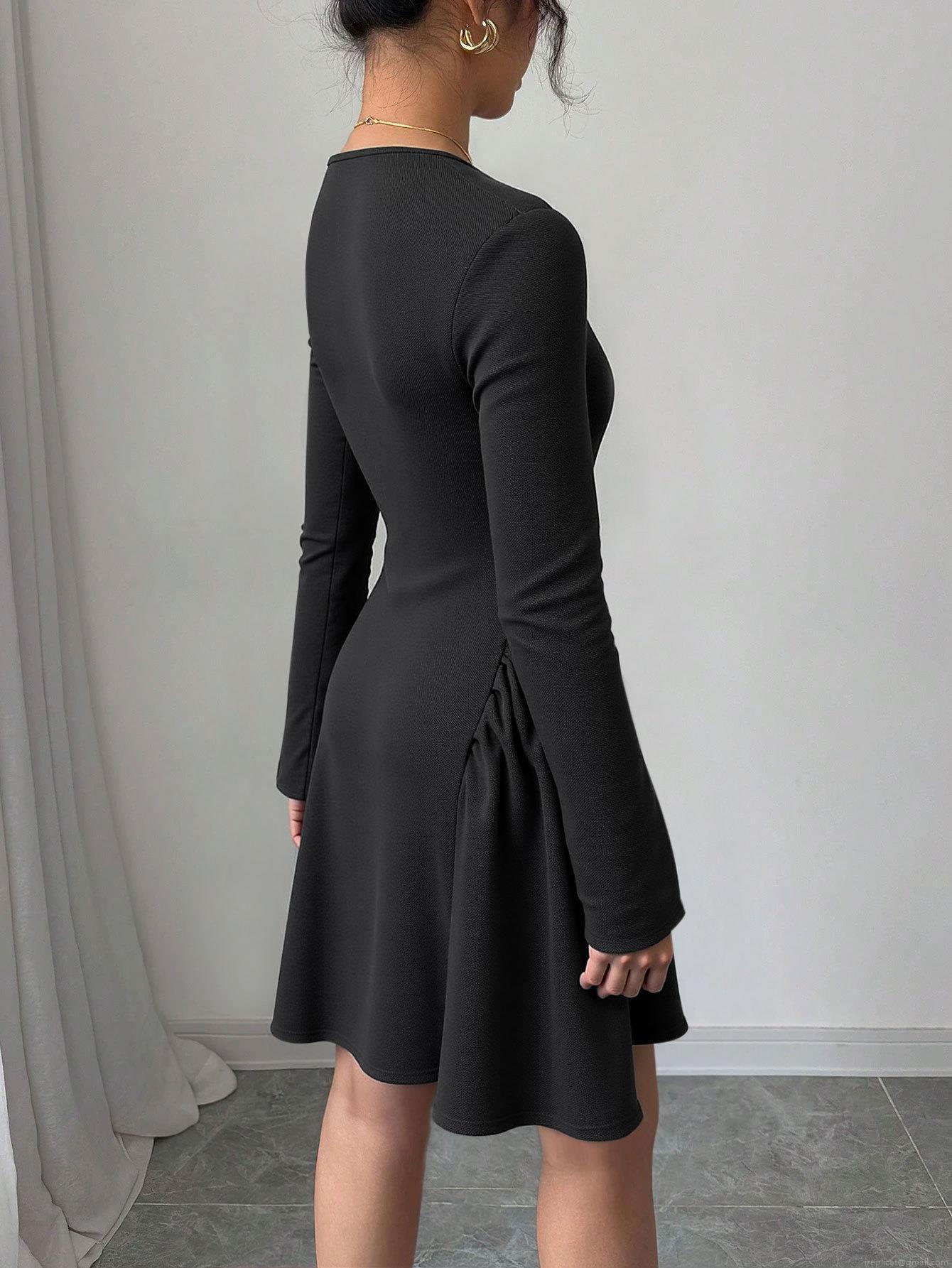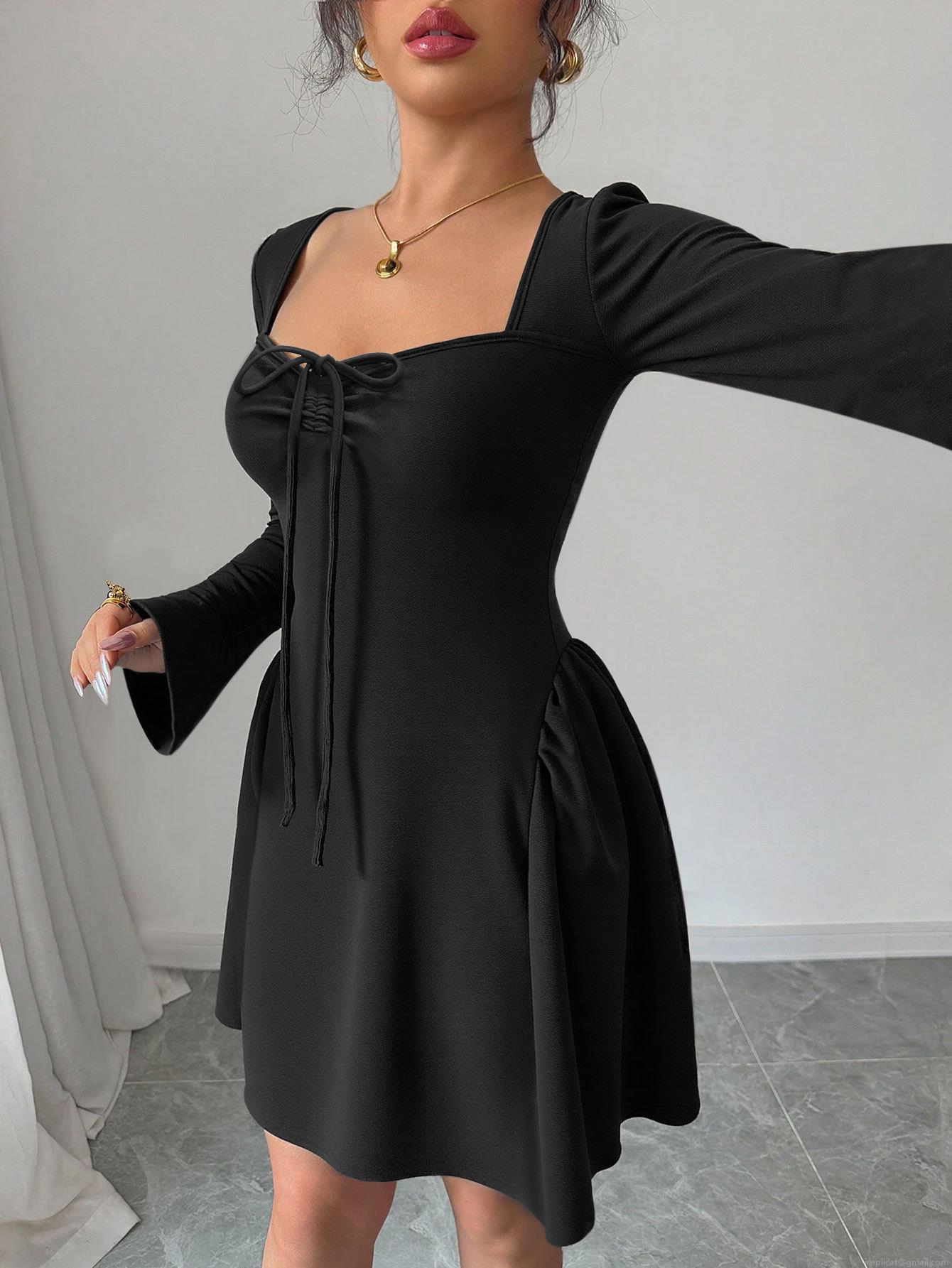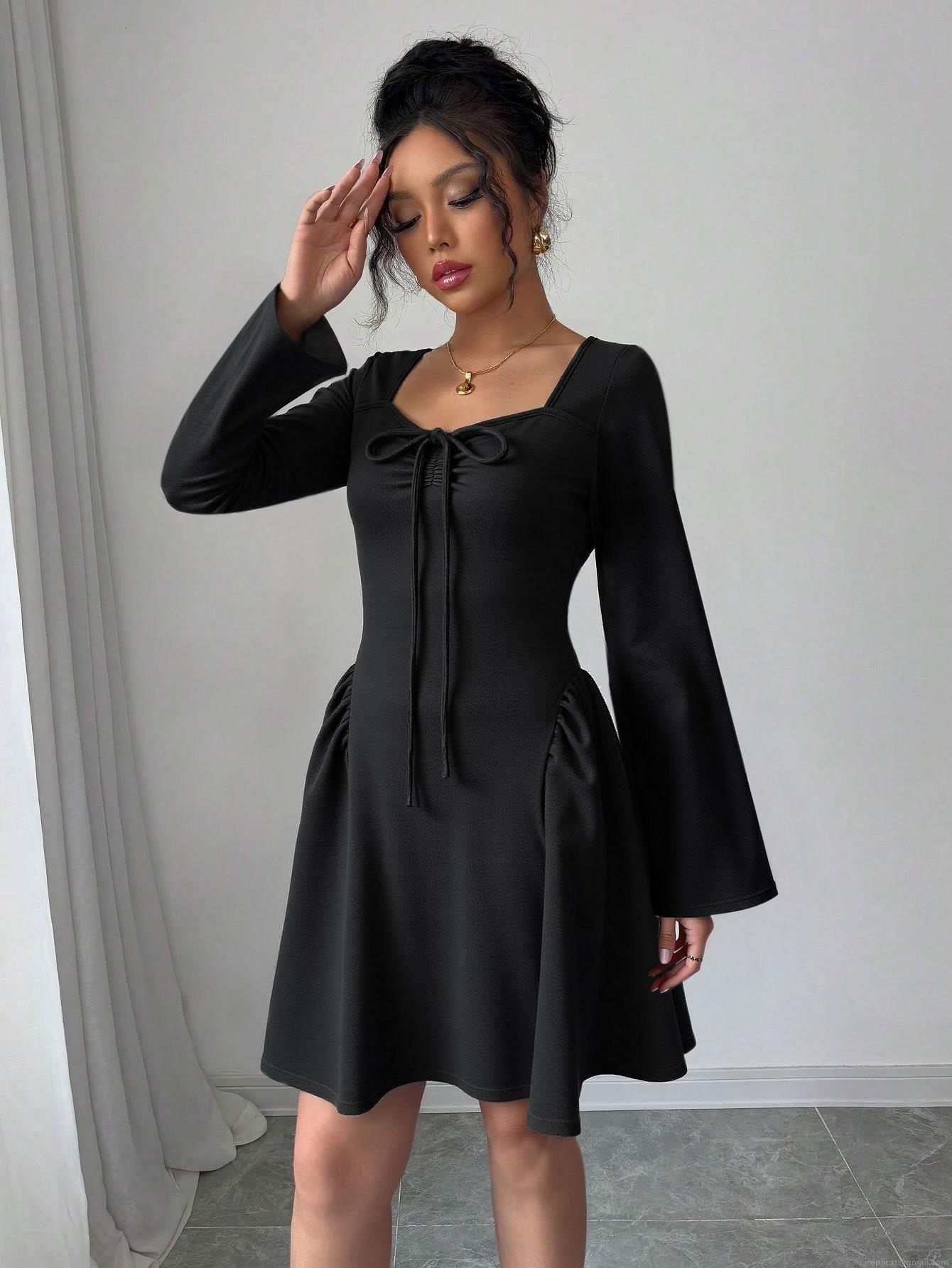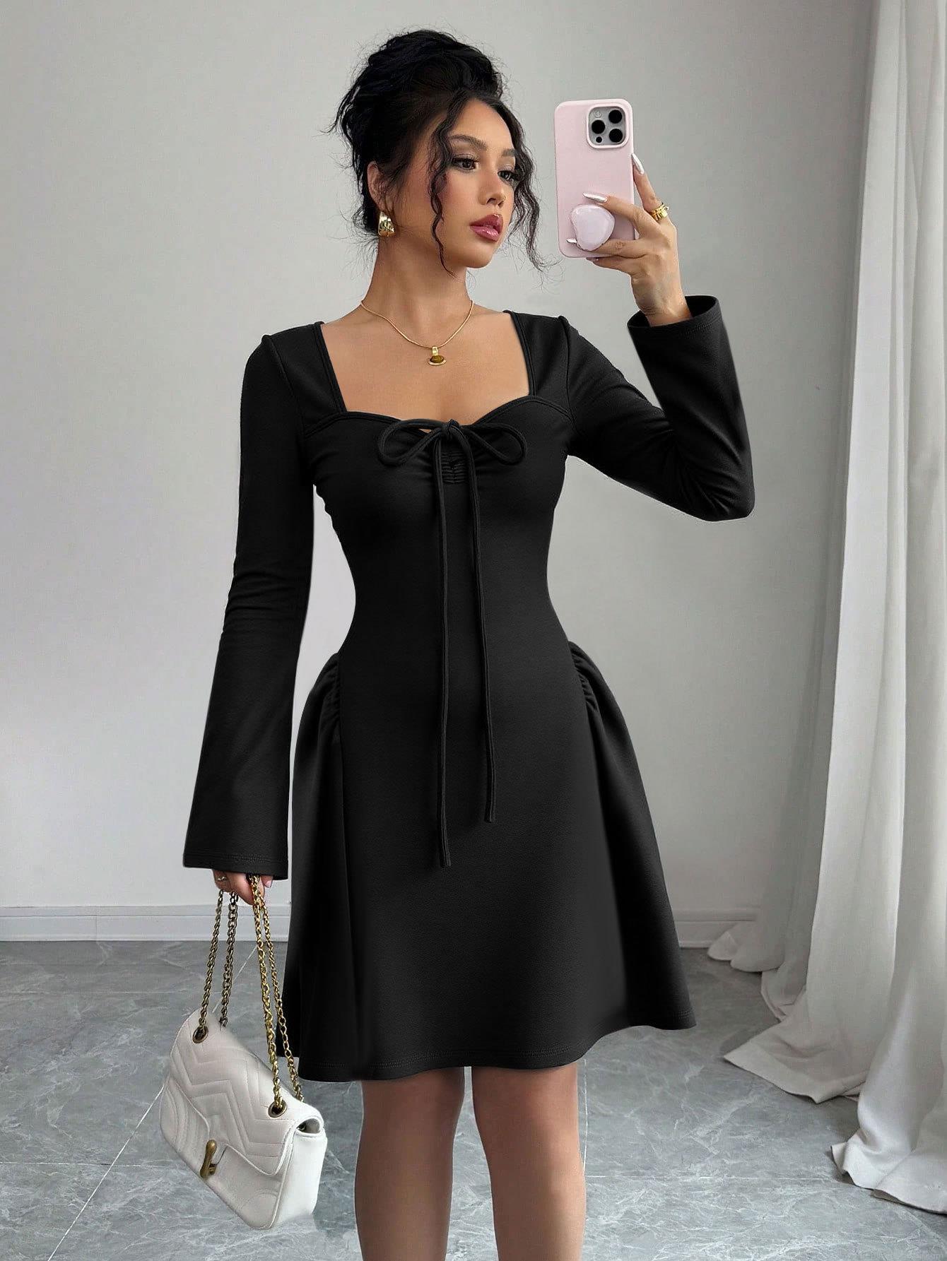 Women's Sexy Black Long Sleeve Mini Dress Square Neck Bodycon Knit Party Dress With Bow Tie Knot And Ruched Detail Elegant Autumn Winter Clubwear Evening Dress