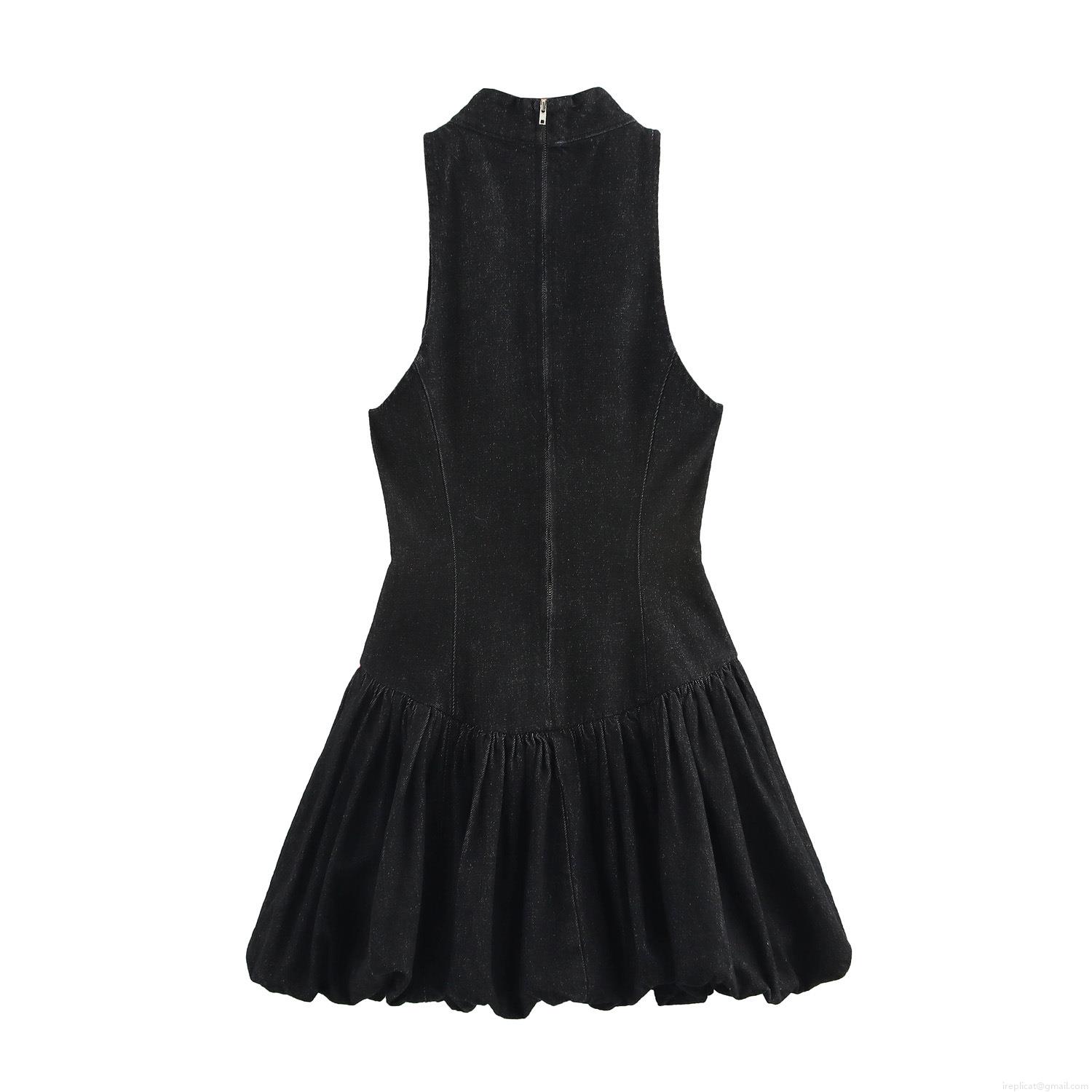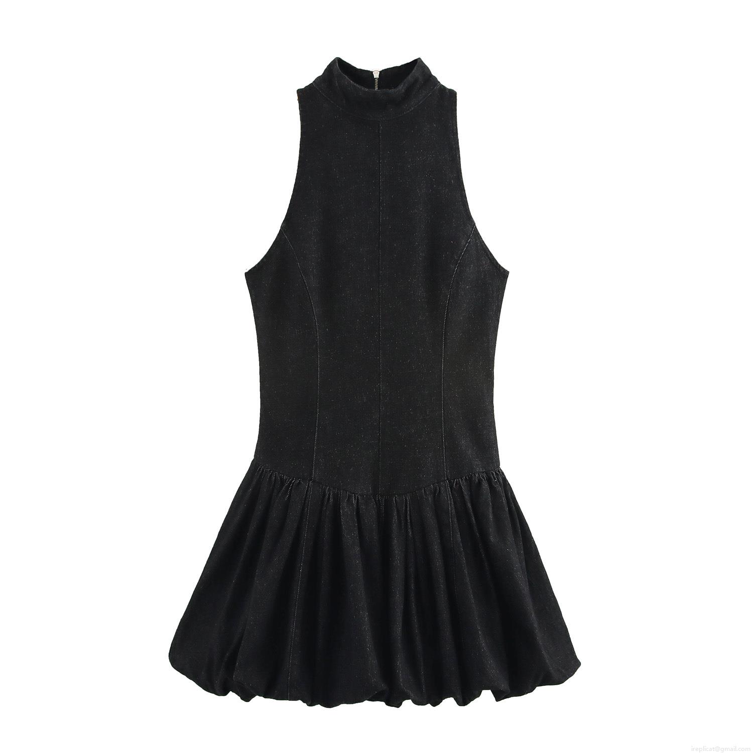• Women's Sexy Black Mock Neck Sleeveless Denim Look Polyester Mini Dress Bubble Hem Tulip Skirt Elegant Slim Fit Short Party Clubwear Dress