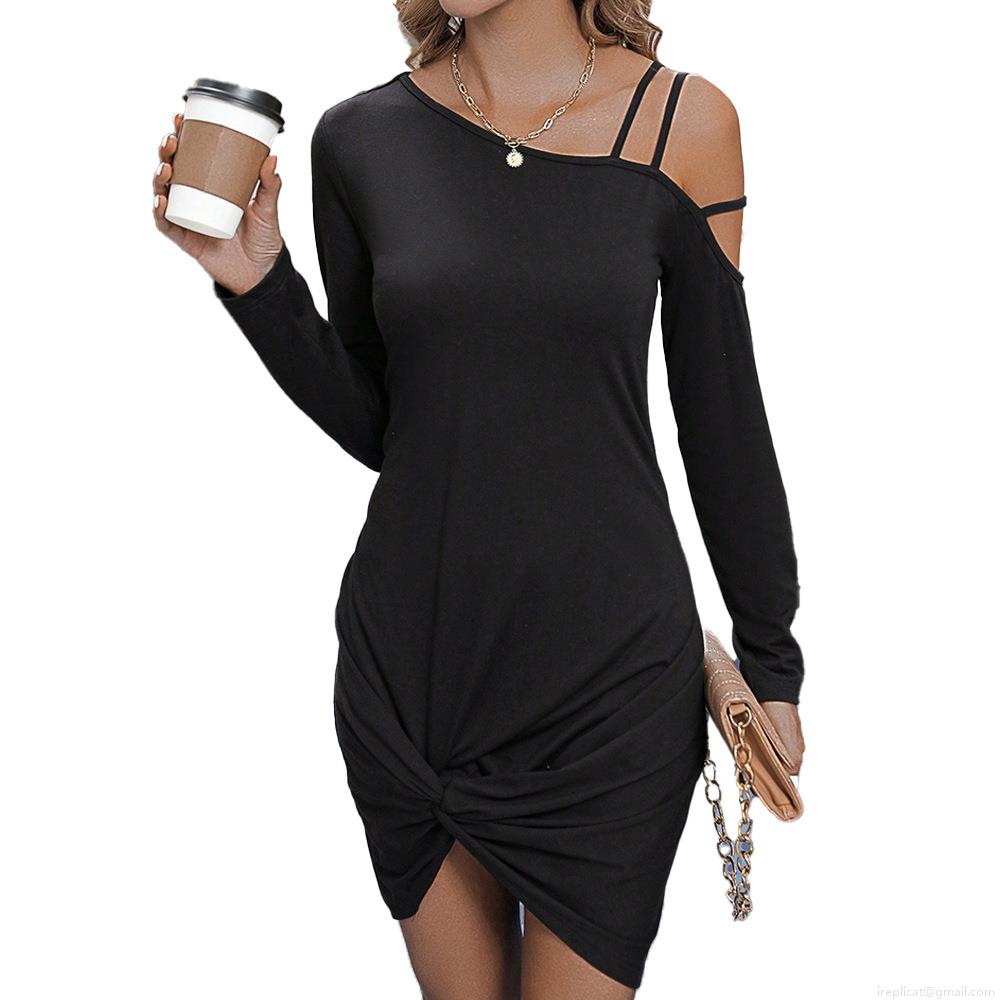 • Women's Sexy Black Off Shoulder Mini Dress Long Sleeve Slanted Neck Knot Ruched Hem Knitted Bodycon Party Evening Dress Cotton Polyester Blend