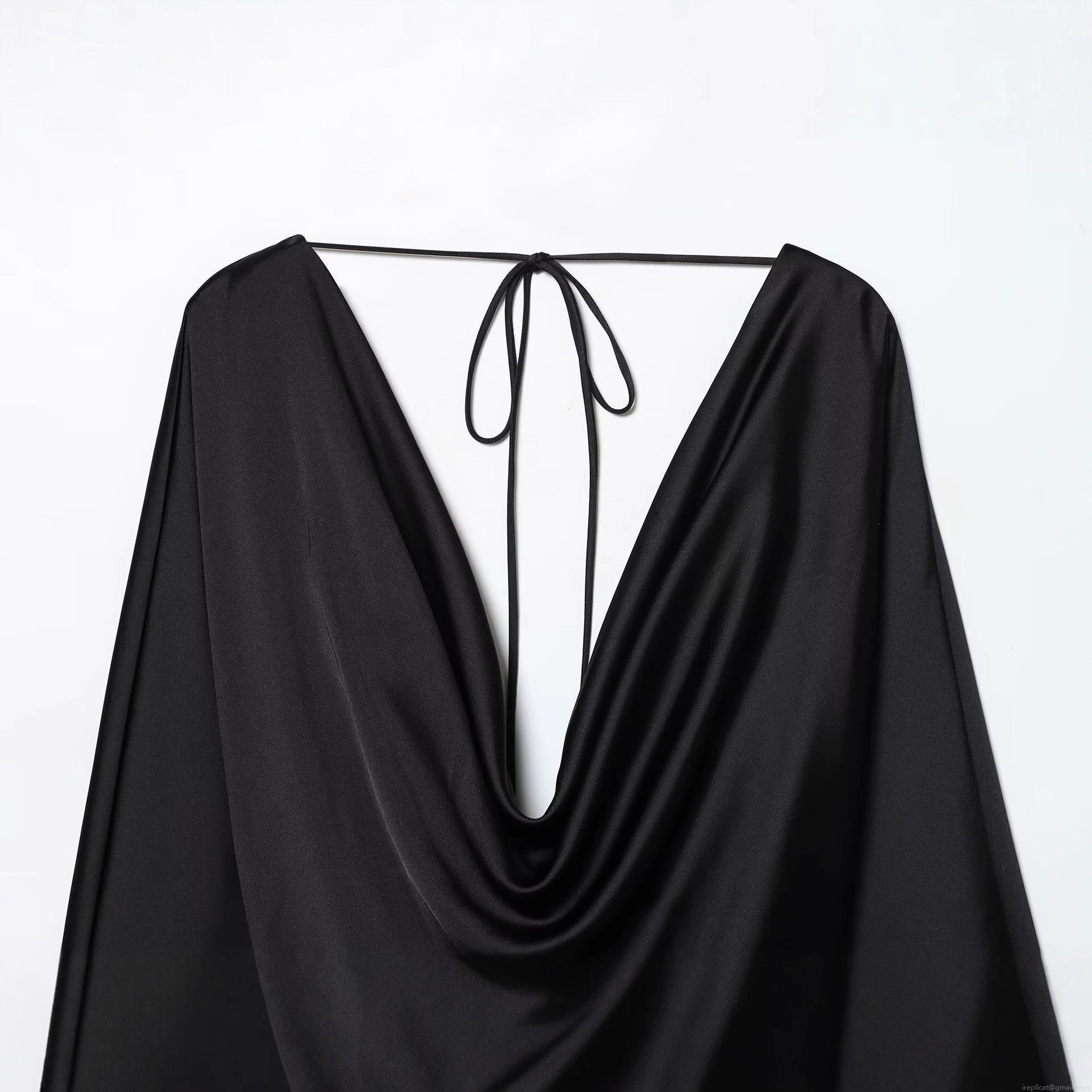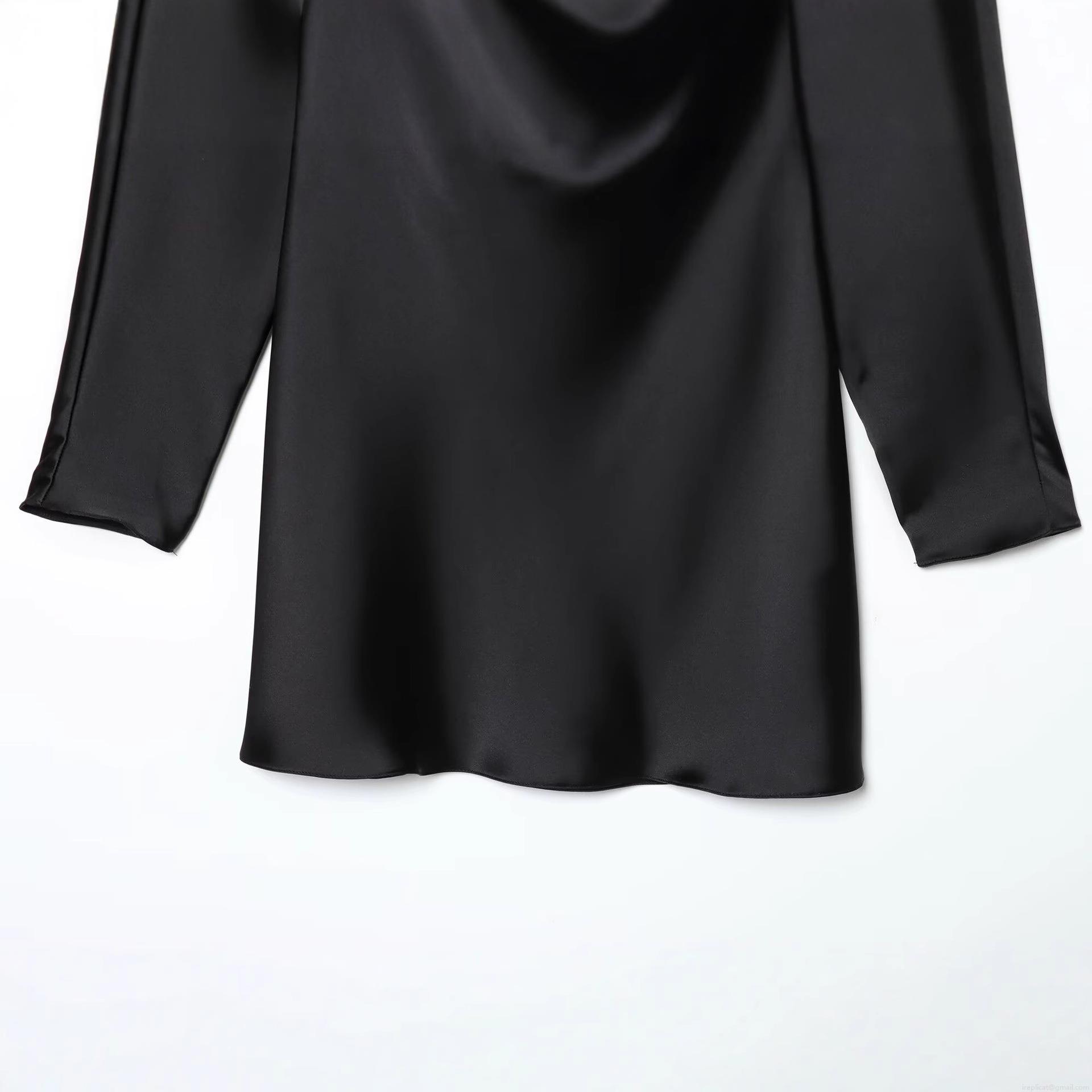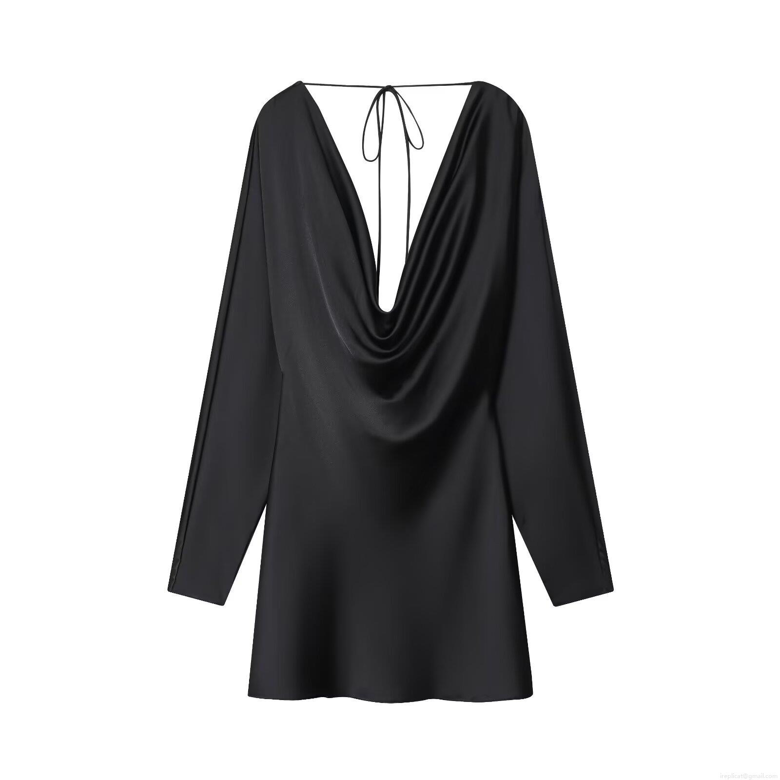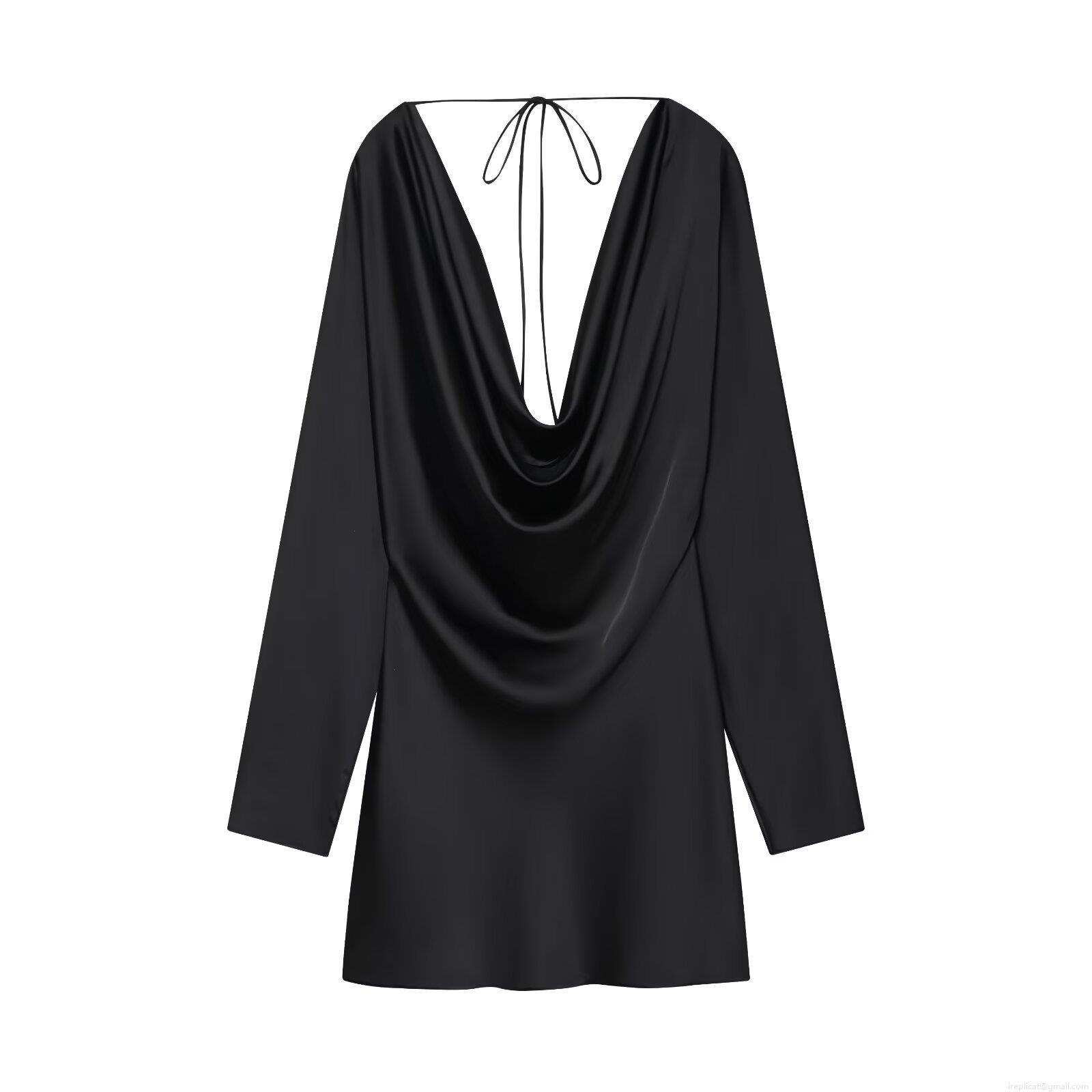 • Women's Sexy Black Satin Cowl Neck Mini Dress Elegant Long Sleeve Backless Tie-Back Draped Cocktail Party Dress For Ladies