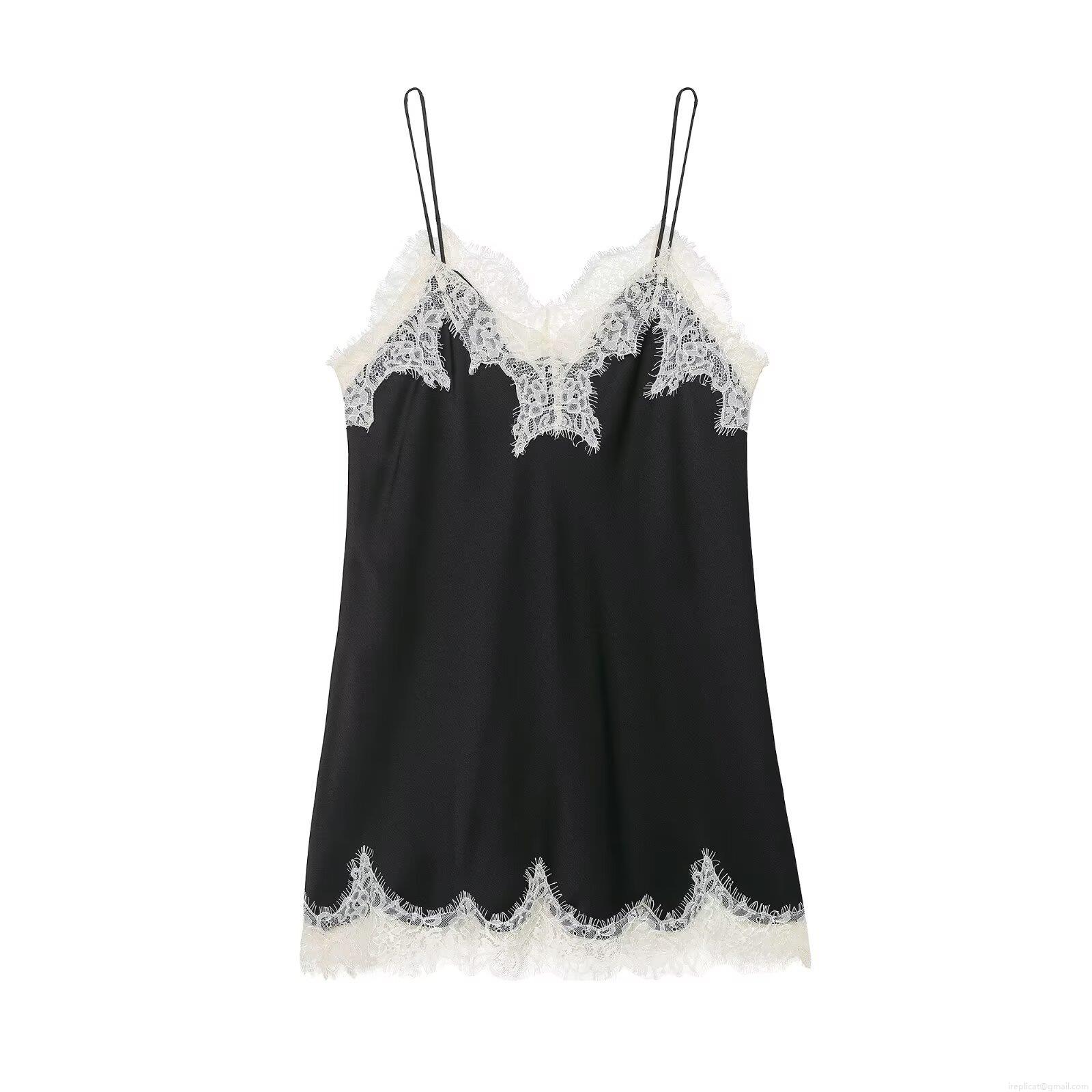 • Women's Sexy Black Satin Mini Slip Dress With White Eyelash Lace Trim Spaghetti Strap V-Neck Sleeveless Chemise Nightgown For Party Clubwear