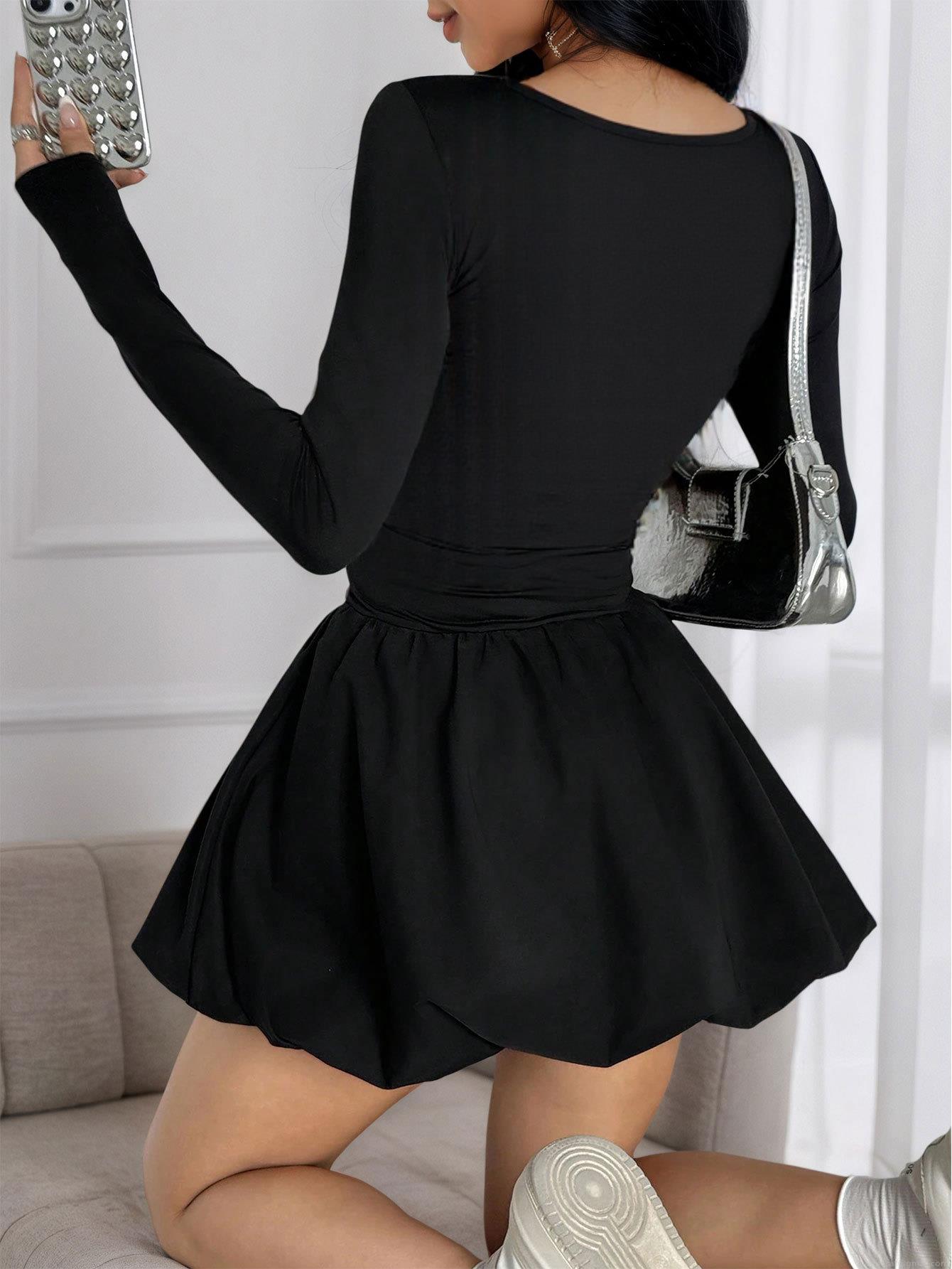 • Women's Sexy Black Square Neck Long Sleeve Mini Dress Ruffle Bubble Hem Slim Fit Bodycon Elegant Party Evening Cocktail Dress For Women