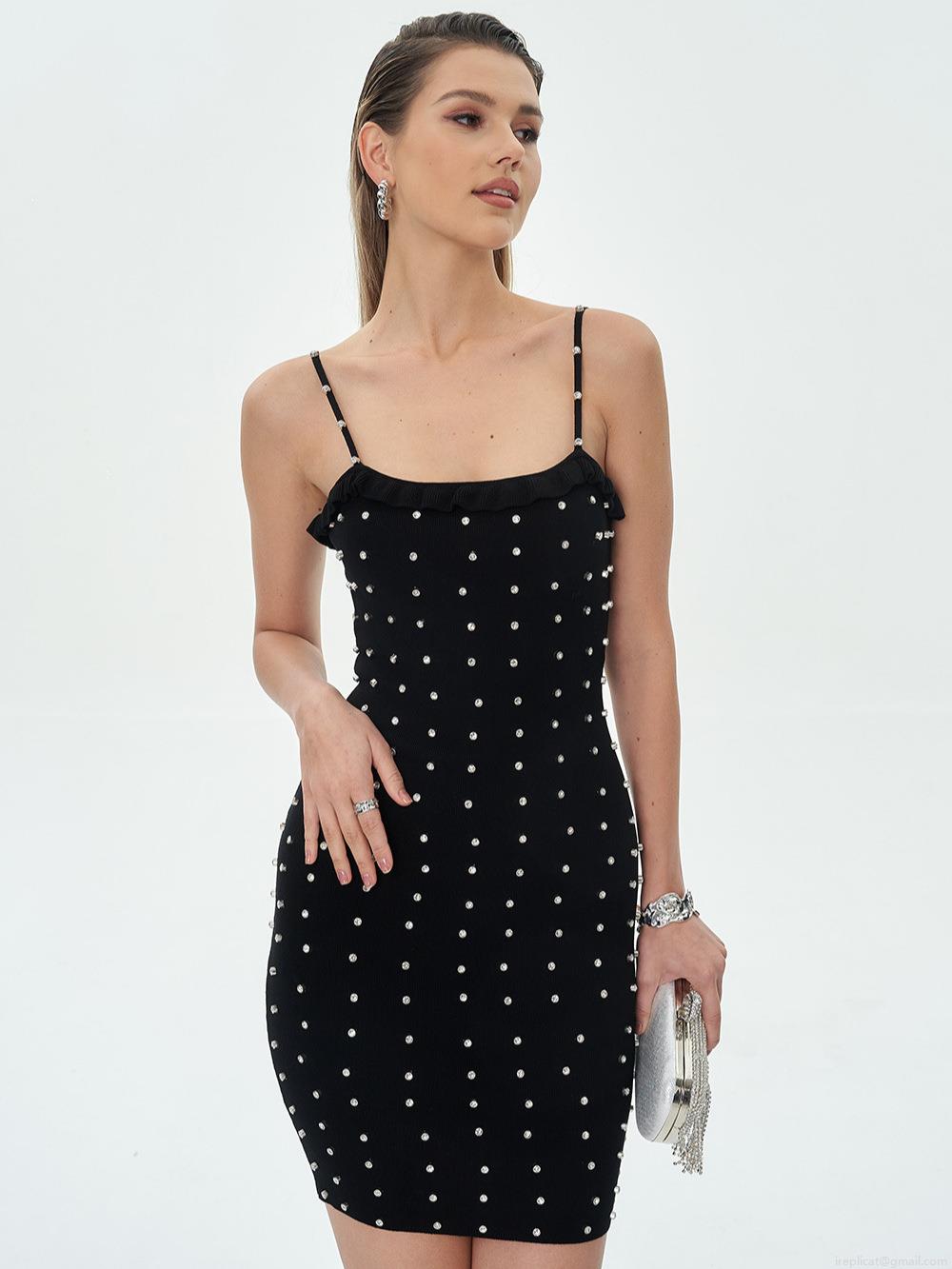 • Women's Sexy Bodycon Cami Mini Dress Rivet Rhinestone Studded Ribbed Knit Summer Ruffle Neckline Streetwear Party Night Clubwear Slim Fit Sleeveless Dress