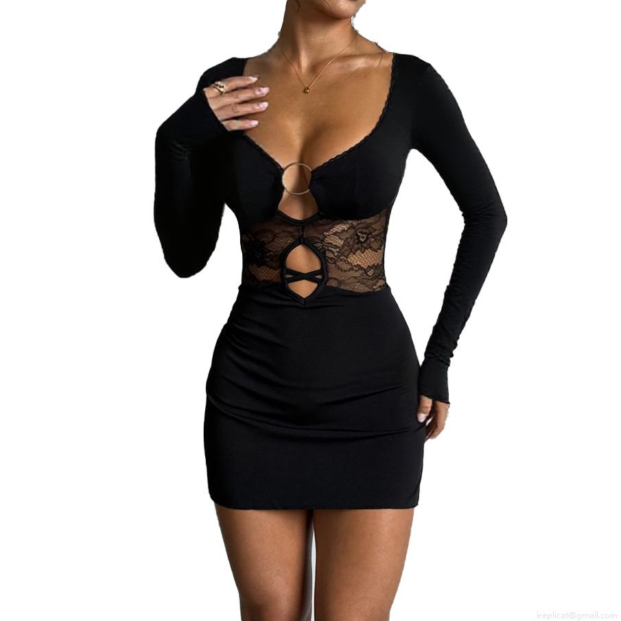 • Women's Sexy Bodycon Mini Dress Lace Patchwork Long Sleeve Hollow Out Knit Dress With Metal Ring Deep V Neck Clubwear Polyester Spandex Dress