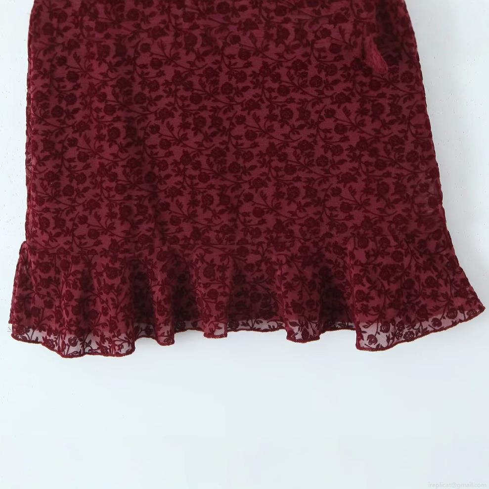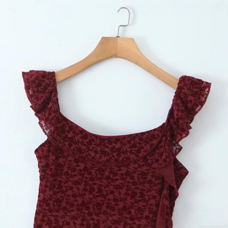 • Women's Sexy Burgundy Flocked Mesh Mini Dress Sleeveless Square Neck Ruffle Floral Rose Pattern Bodycon Party Dress With Shoulder Ribbon