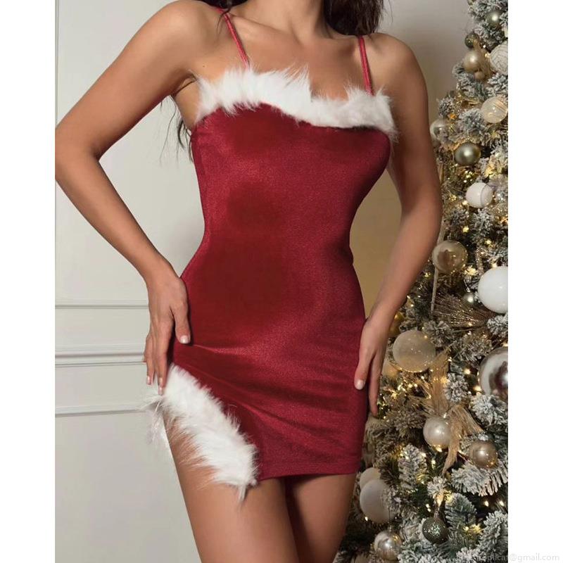 • Women's Sexy Christmas Red Velvet Mini Dress With White Faux Fur Trim Slit Bodycon Cami Dress For Party Nightclub Evening Outfits
