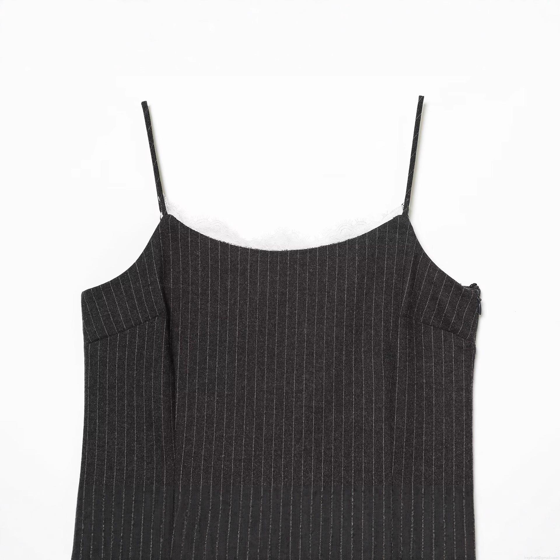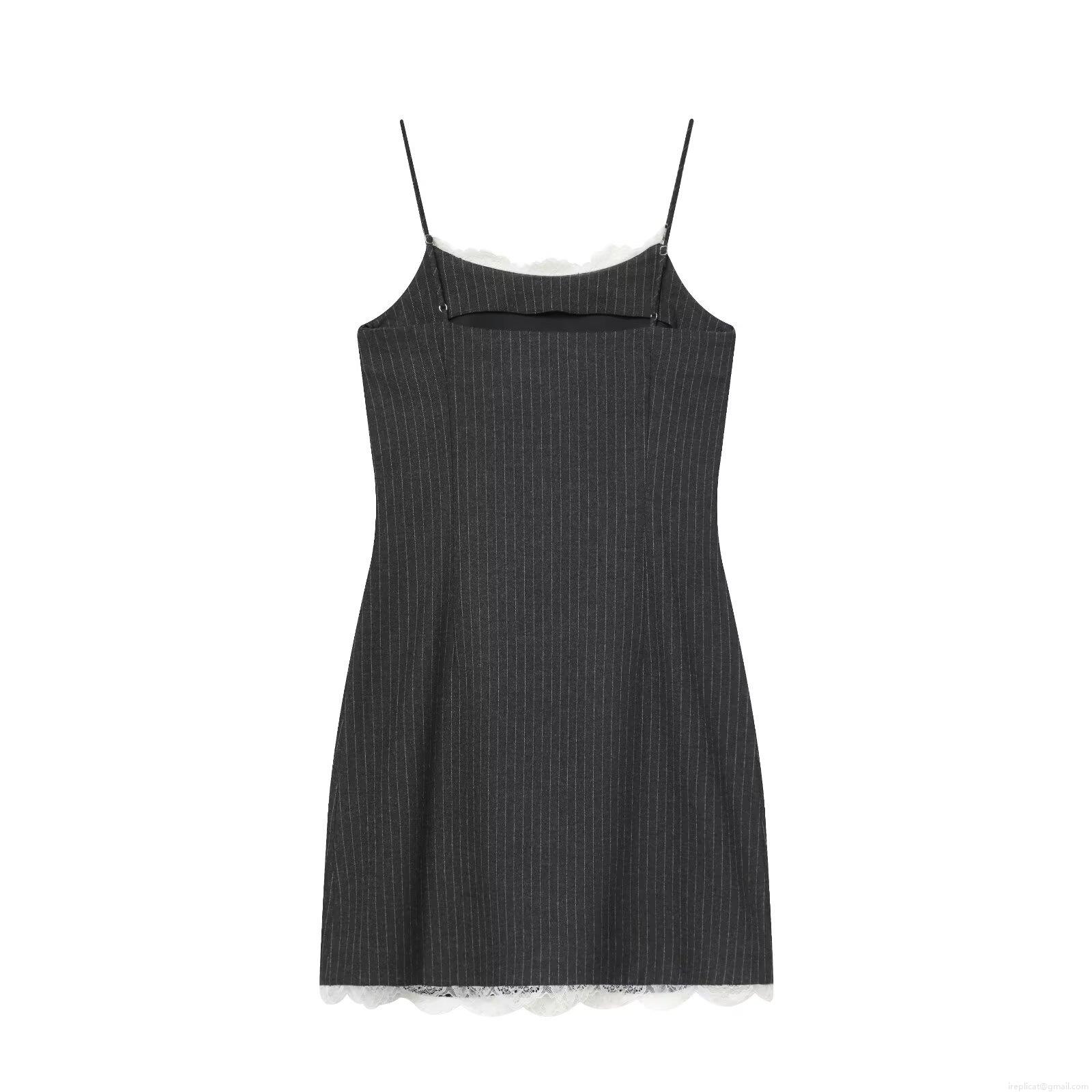 • Women's Sexy Dark Grey Stripe Cami Mini Dress White Lace Trim Spaghetti Strap Slim Fit Backless Bodycon Dress For Party Clubwear
