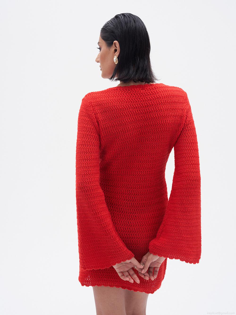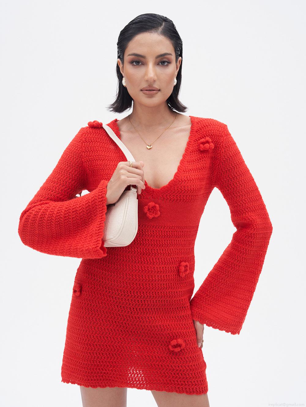• Women's Sexy Deep V Neck 3D Flower Applique Crochet Mini Dress Long Bell Sleeve Knit Bodycon Party Dress Boho Vacation Short Dress