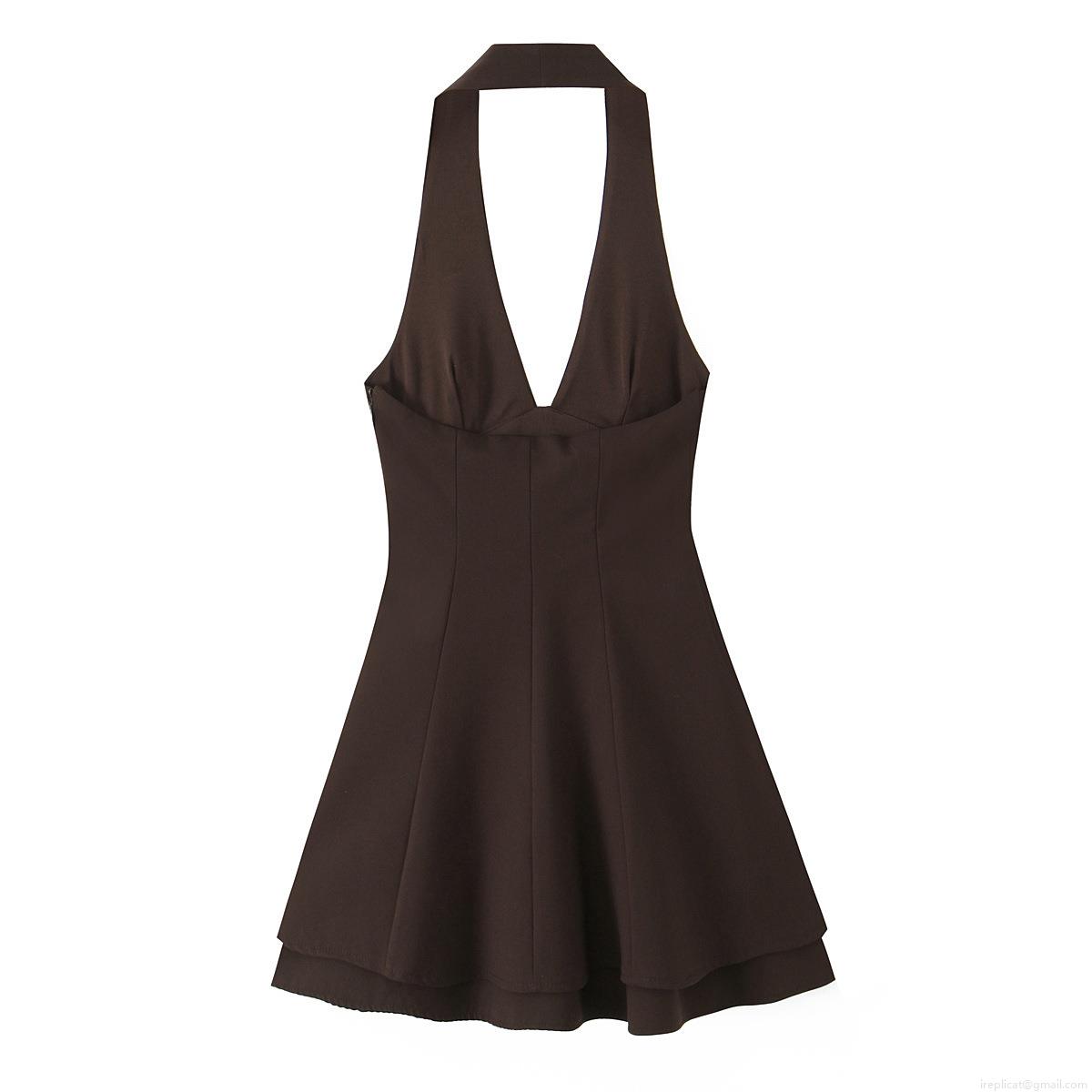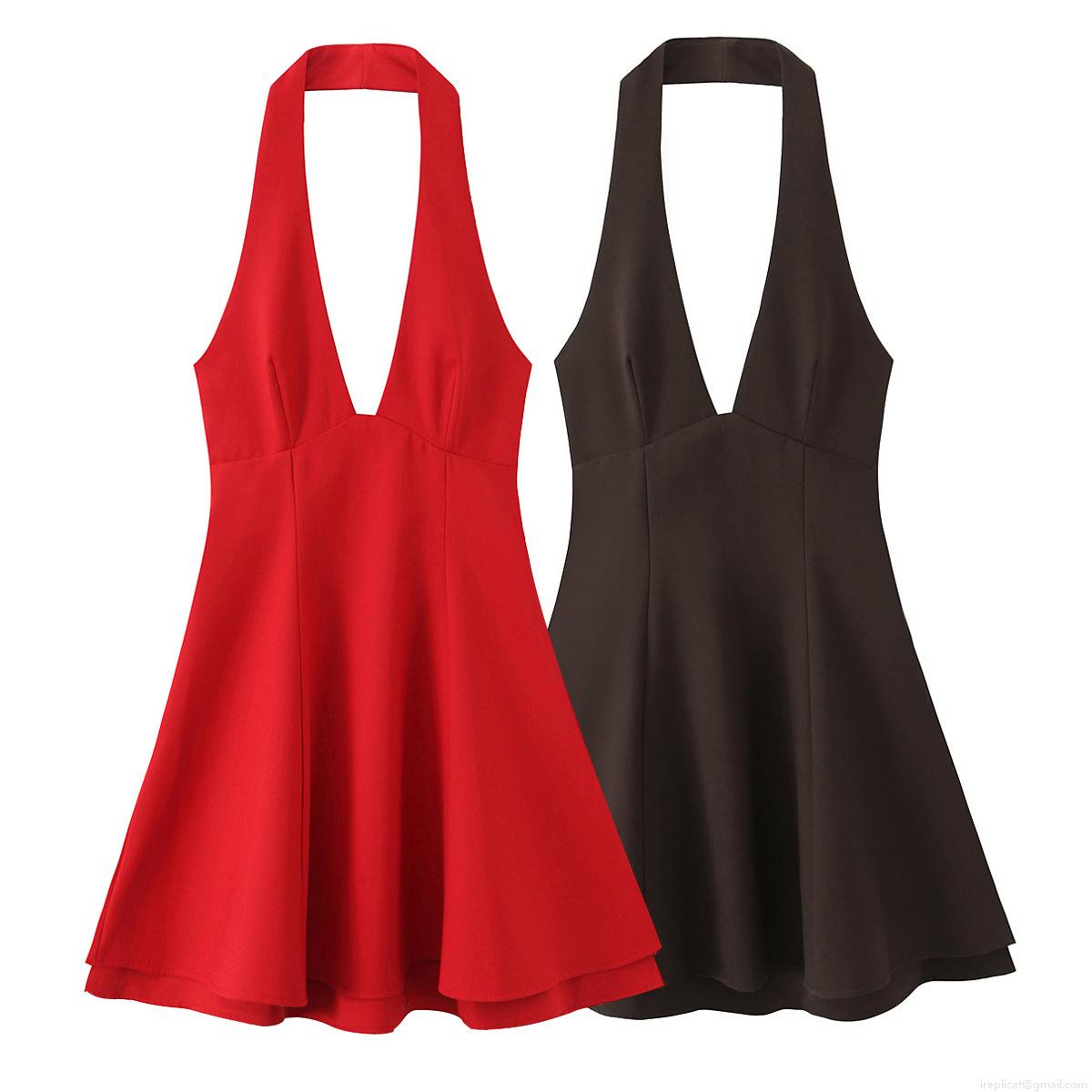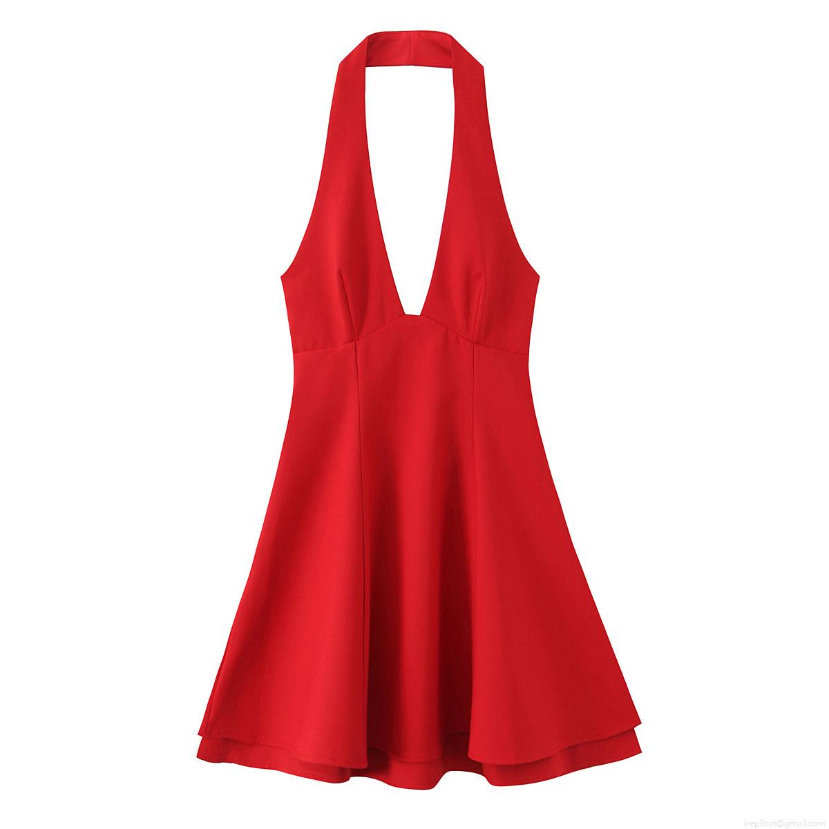 Solid Color, Neckband, Backless, Deep V, Double-layered Skirt