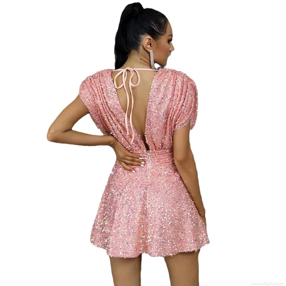• Women's Sexy Deep V Neck Sequin Mini Dress Sleeveless Backless High Waist Tie A-Line Party Cocktail Evening Dress Pink Sparkly Short Skirt