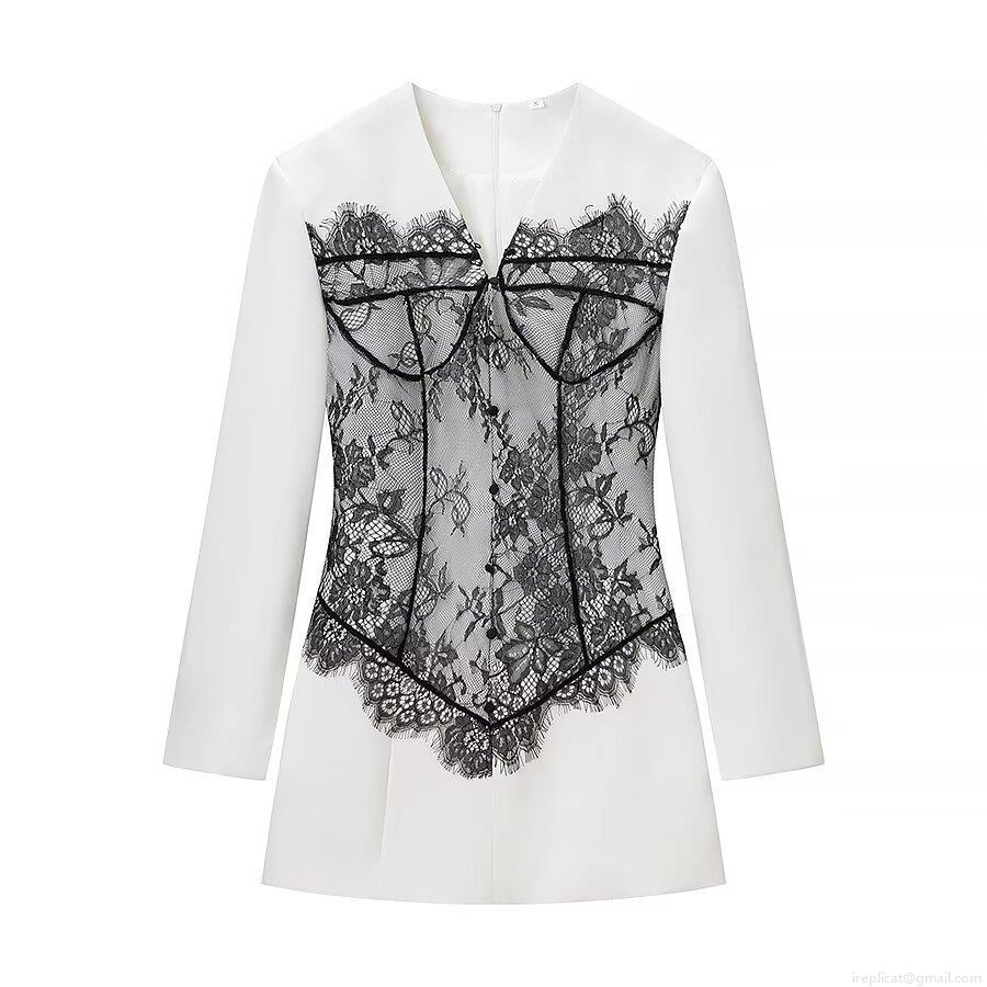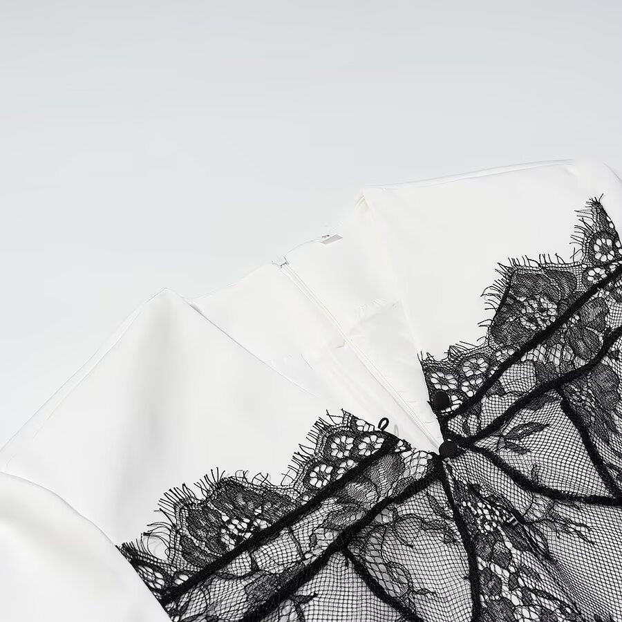 • Women's Sexy Deep V-Neck Long Sleeve Lace Patchwork Blazer Dress Elegant Black and White Contrast Polyester Mini Bodycon Dress for Party Nightclub
