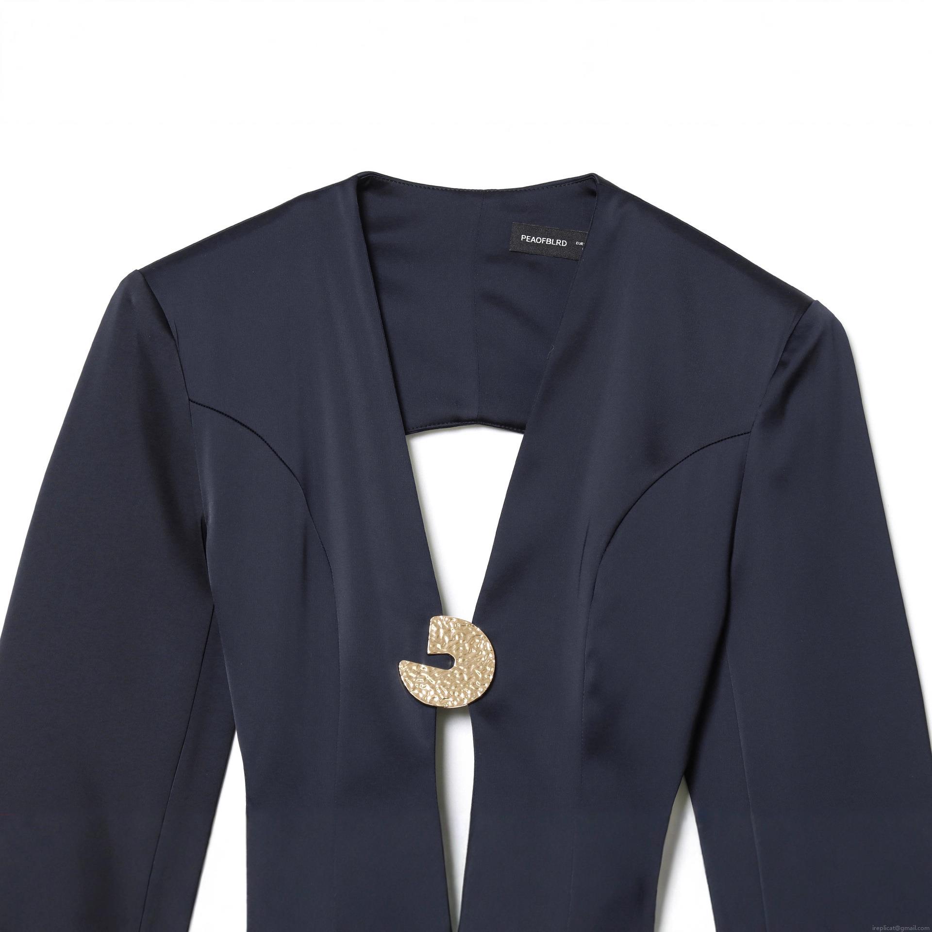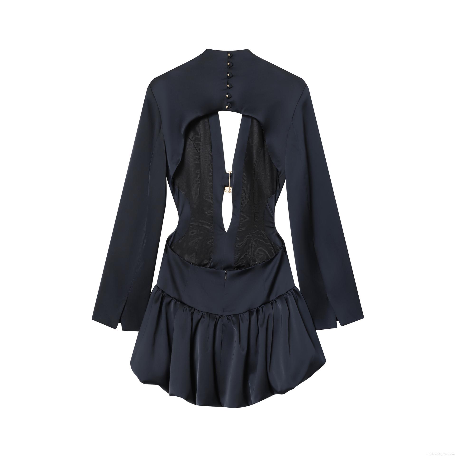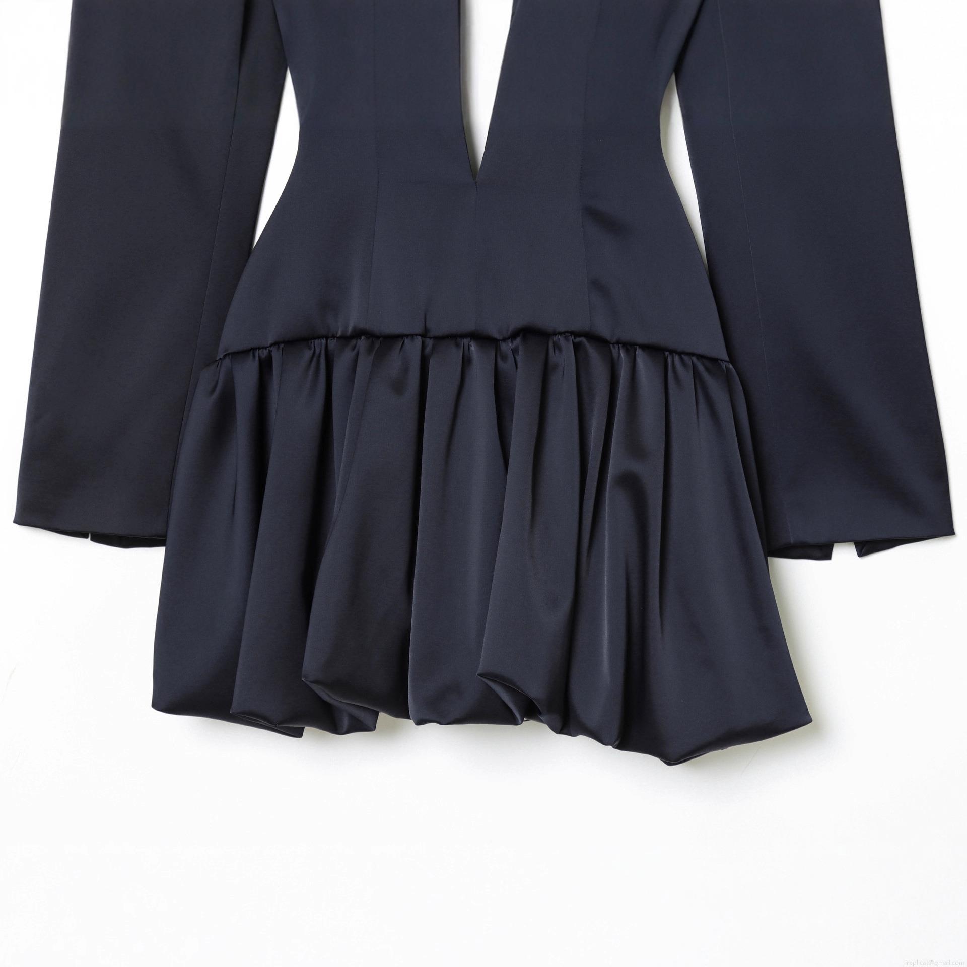 • Women's Sexy Deep V-Neck Long Sleeve Satin Bubble Hem Mini Dress Elegant Backless Party Club Dress With Gold Metal Ring Buckle