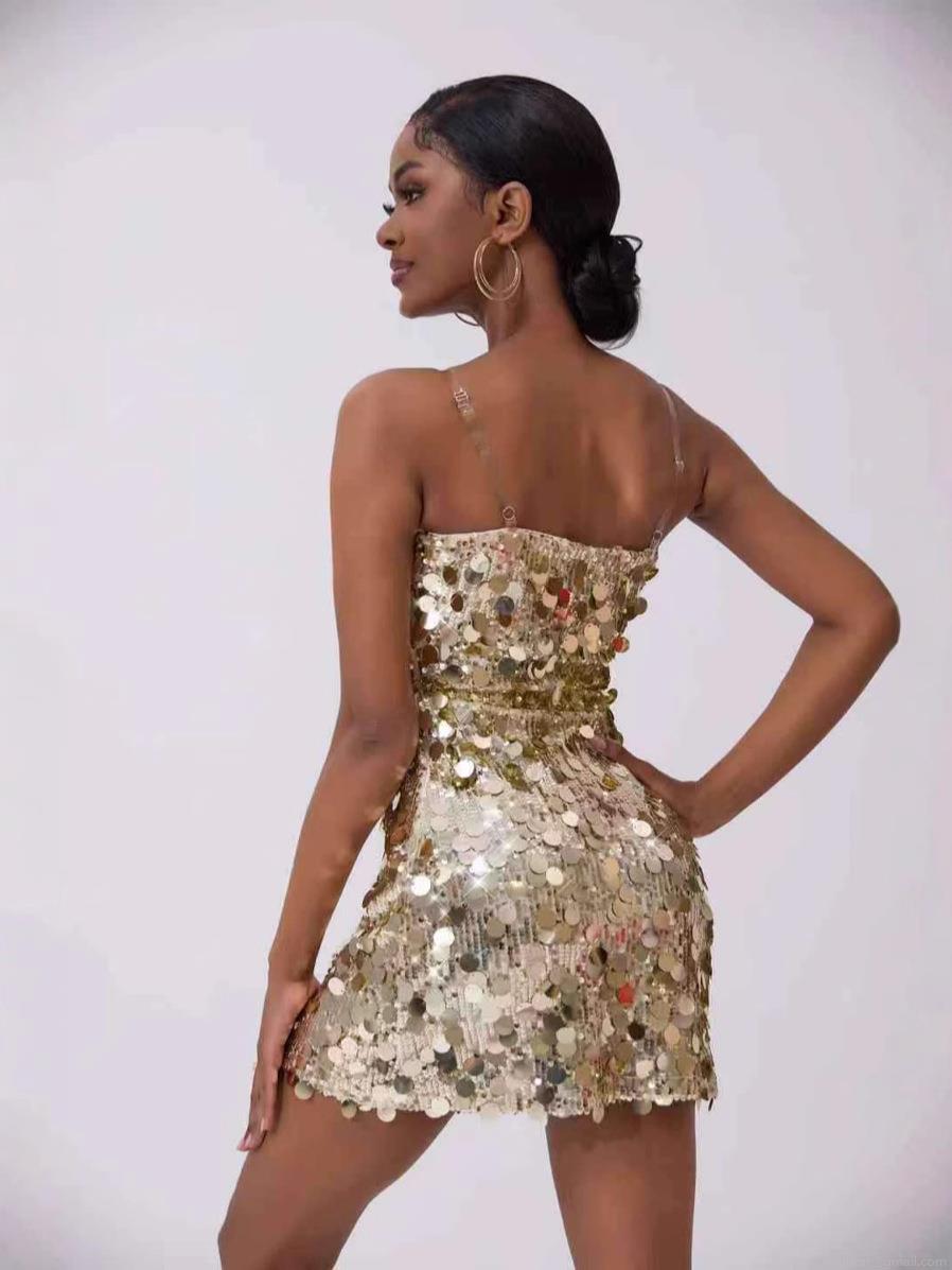 • Women's Sexy Gold Sequin Mini Dress Slim Fit Backless Ruched Spaghetti Strap Clubwear Party Evening Night Out Dress