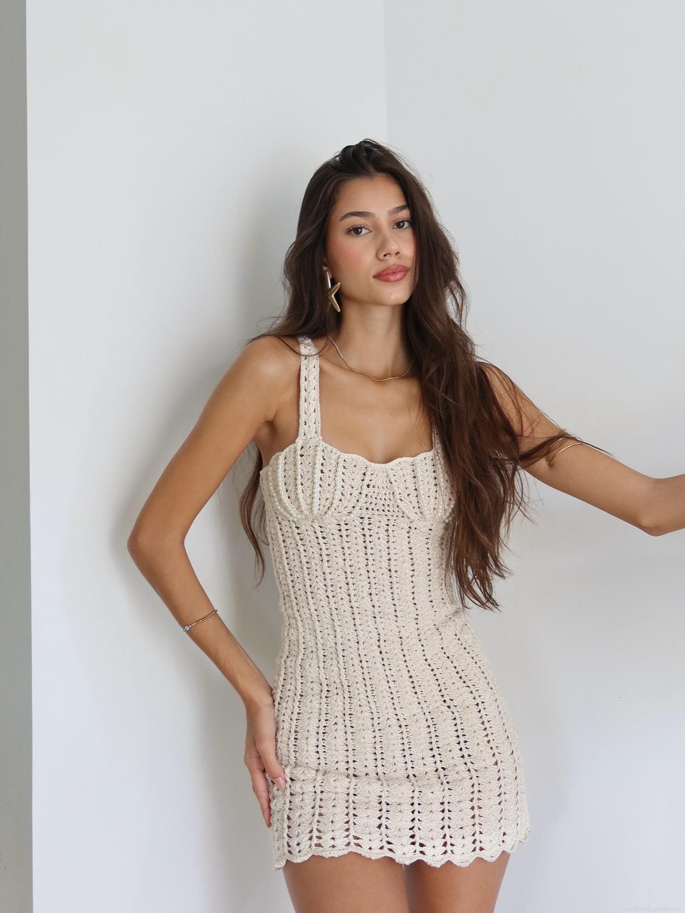 • Women's Sexy Halter Crochet Mini Dress Pearl Beaded Backless Knit Dress Cotton Blend Hollow Out Slim Fit Summer Beach Vacation Party Boho Style Elegant Short Sleeveless Dress