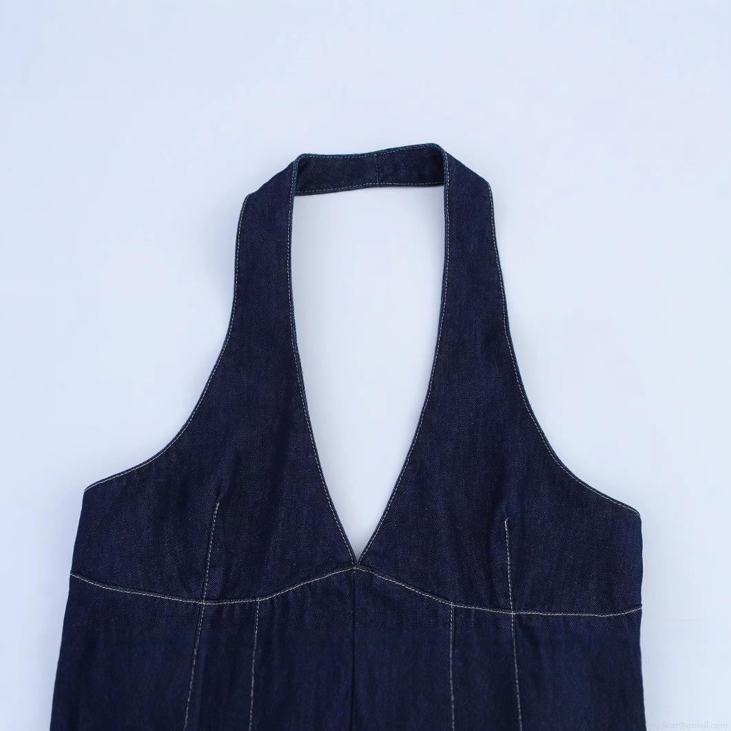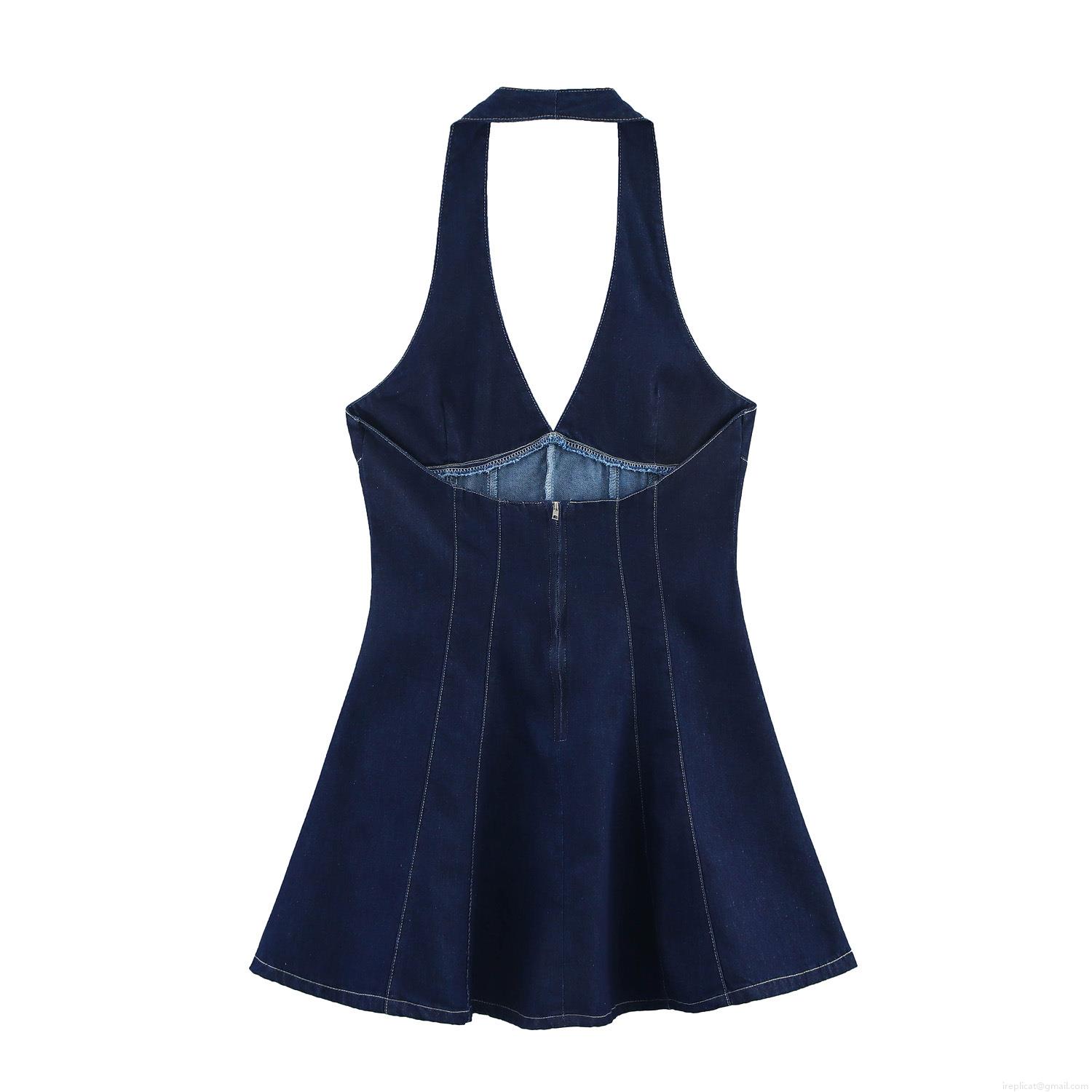 • Women's Sexy Halter Denim Mini Dress Deep V Neck Back Zipper Slim Fit Cotton Blend Denim Sleeveless Short Dress With Contrast Stitching Elegant Socialite Style Summer Party Outfits