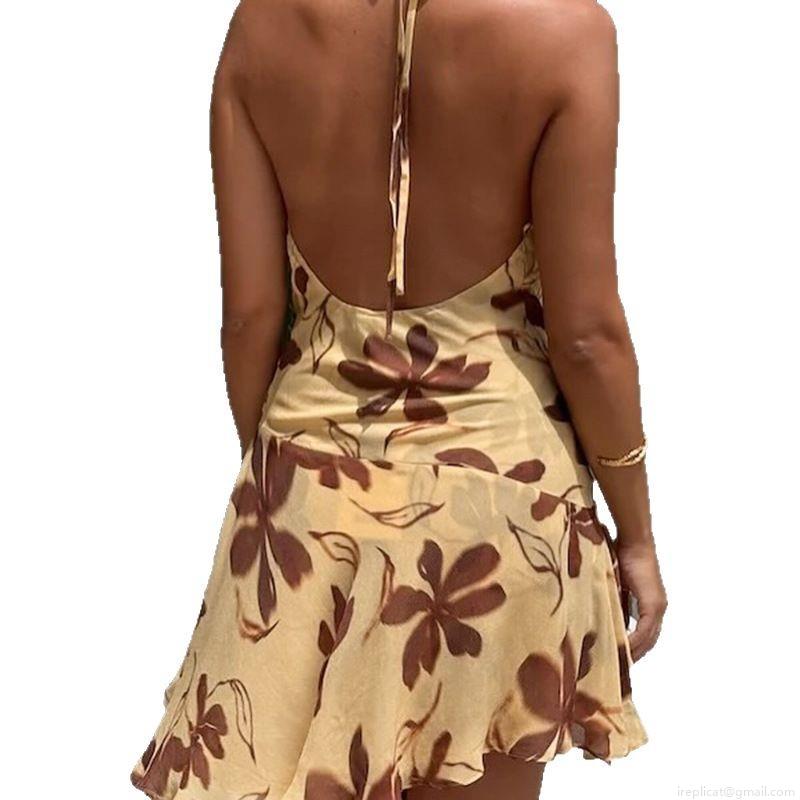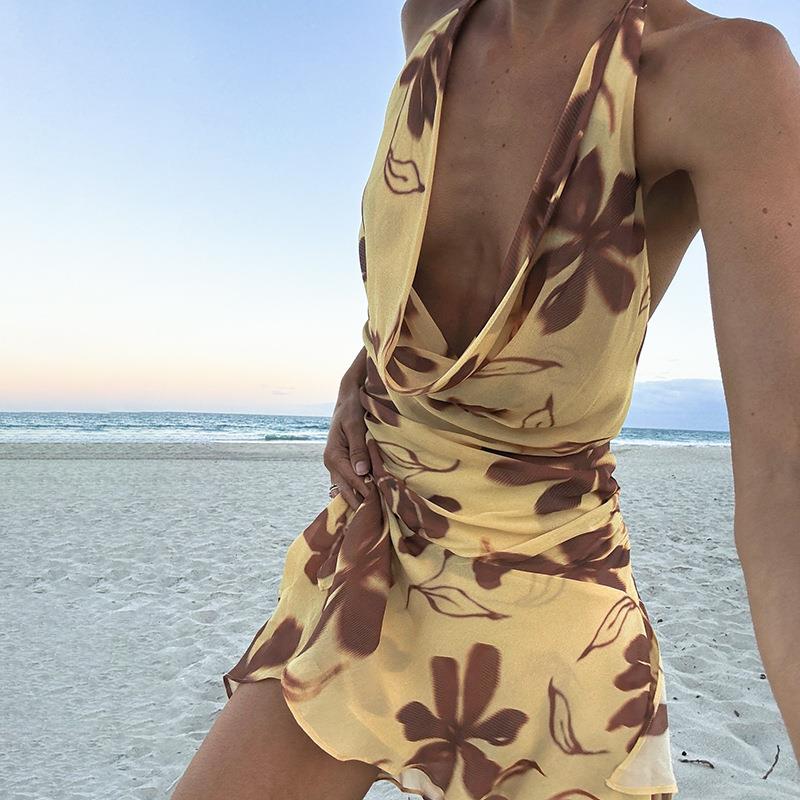 • Women's Sexy Halter Neck Backless Floral Print Mini Dress Polyester Spandex Mesh Vacation Beach Party Style Slim Fit A-Line Short Dress