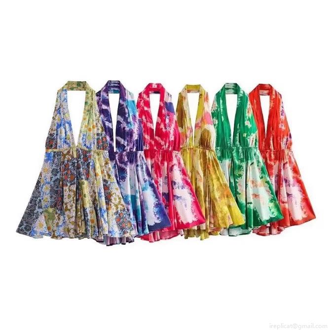 • Women's Sexy Halter Neck Backless Mini Dress Polyester Tie-Dye Floral Print V-Neck Lace-Up Sleeveless Summer Vacation Party Elegant Slim Fit Sundress