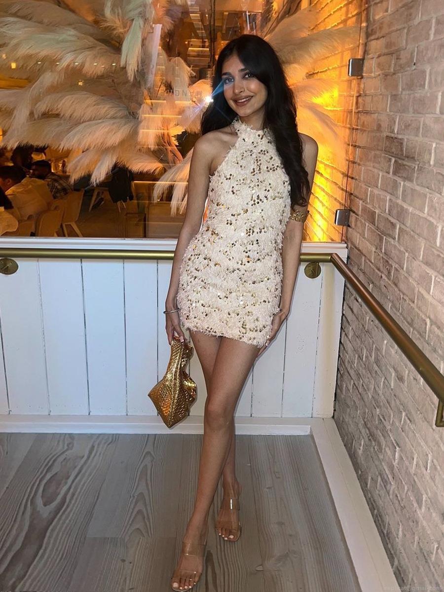 • Women's Sexy Halter Neck Backless Sequin Feather Mini Dress Sparkling Bodycon Party Evening Dress Elegant Sleeveless Cocktail Clubwear Dress