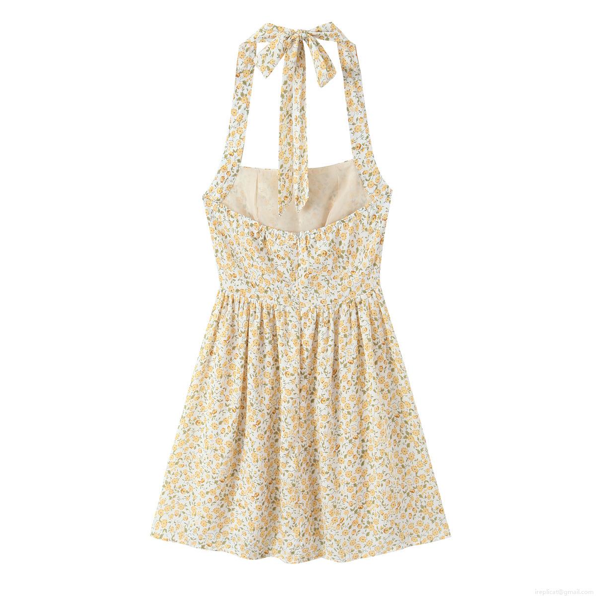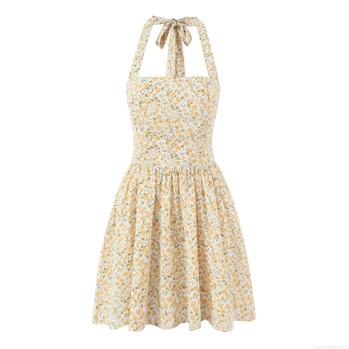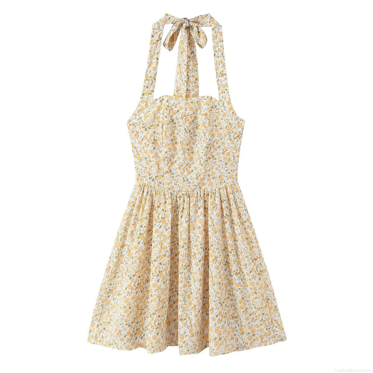 Yellow Floral Pattern, Ribbon Bow, Halter Neck And Backless