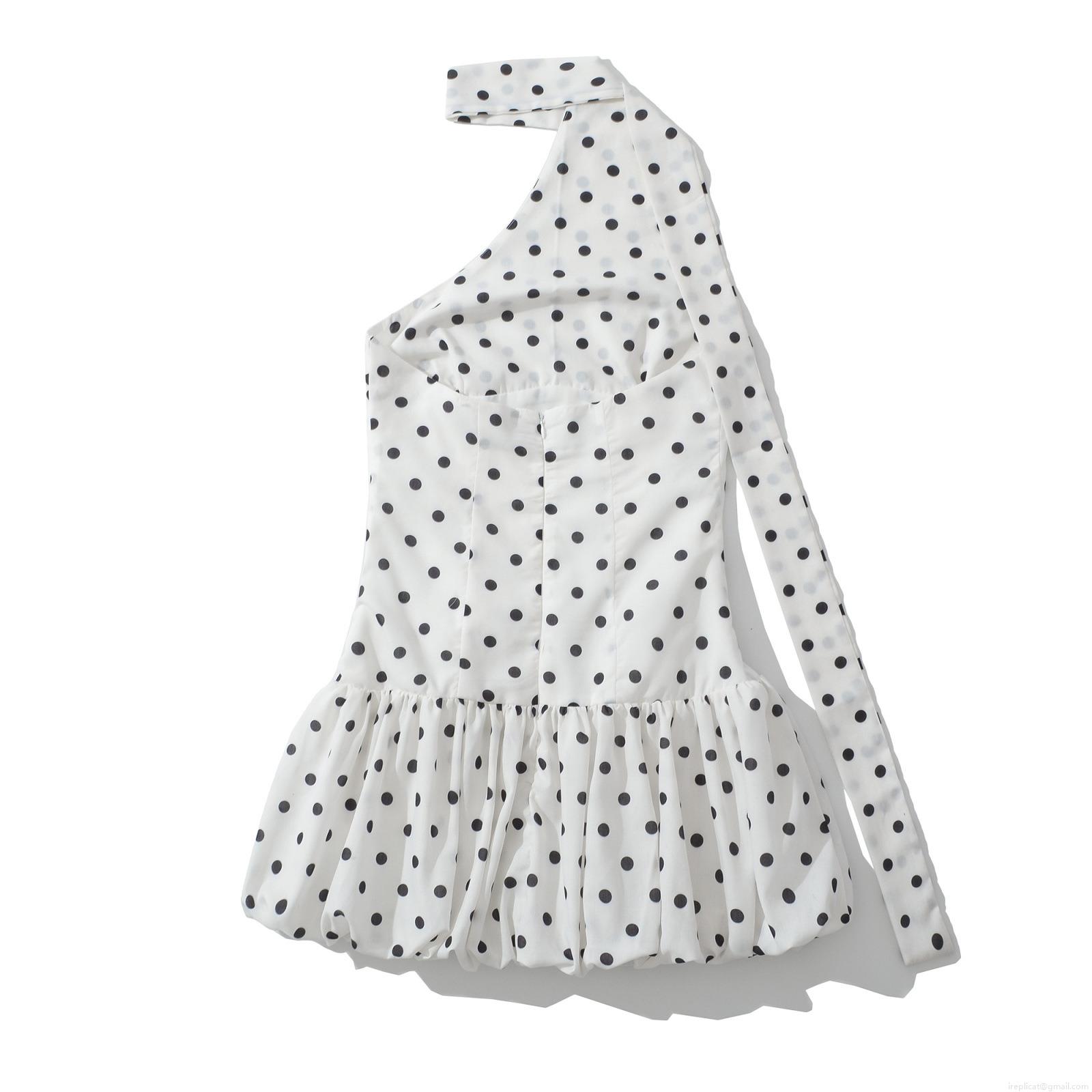 Women's Sexy Halter Neck Polka Dot Mini Dress One Shoulder Ruffle Hem Bow Tie Waist Backless A-Line Party Dress