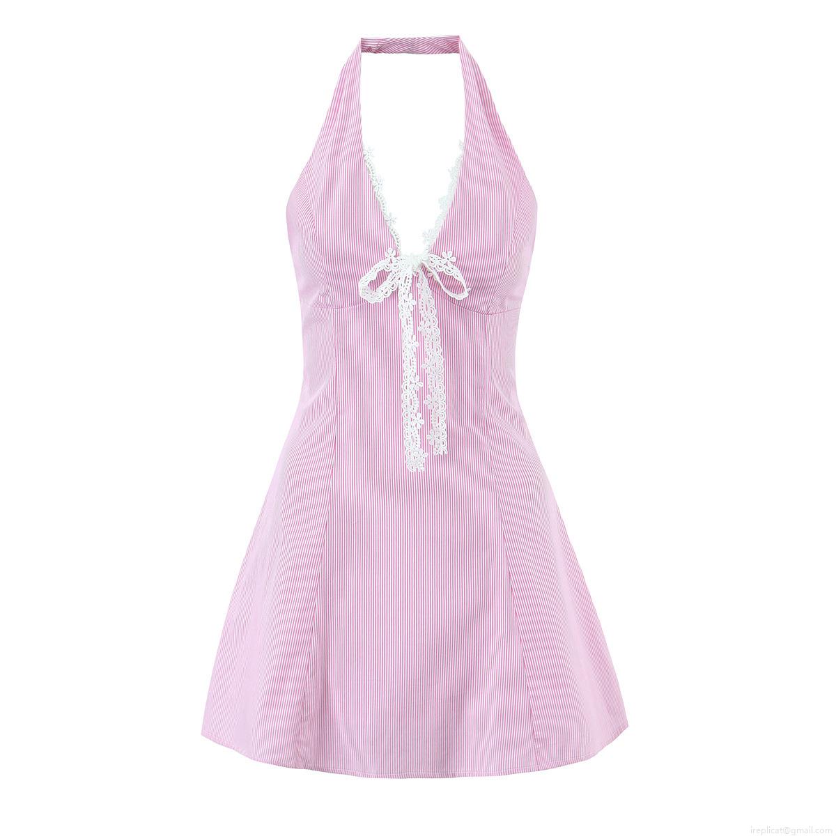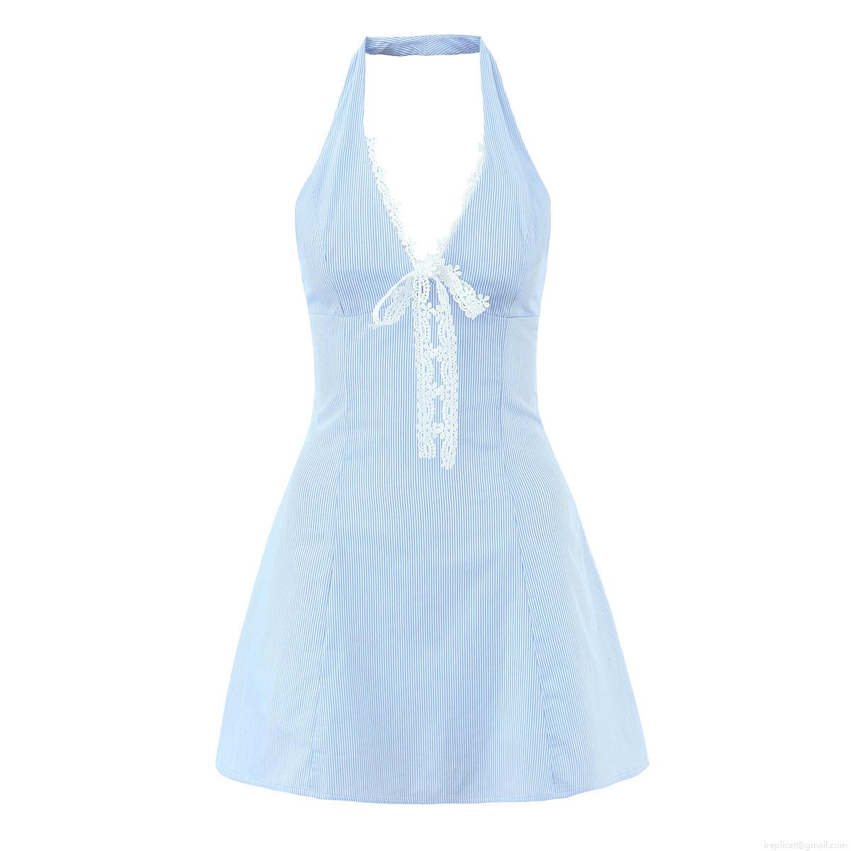 • Women's Sexy Halter Neck Striped Mini Dress Deep V-neck Lace Trim Bow Decoration Backless A-Line Summer Vacation Sweet French Style Sleeveless Short Sun Dress