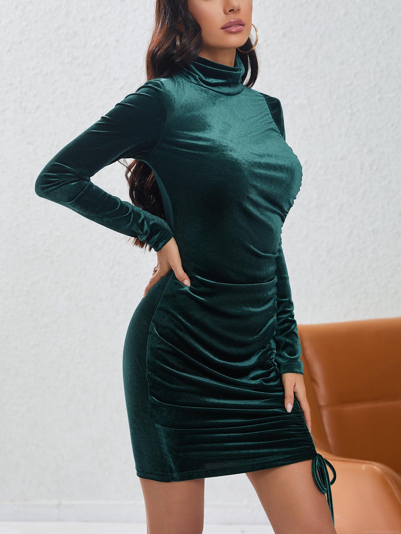 • Women's Sexy High Neck Long Sleeve Velvet Mini Dress Ruched Drawstring Bodycon Party Club Sheath Dress