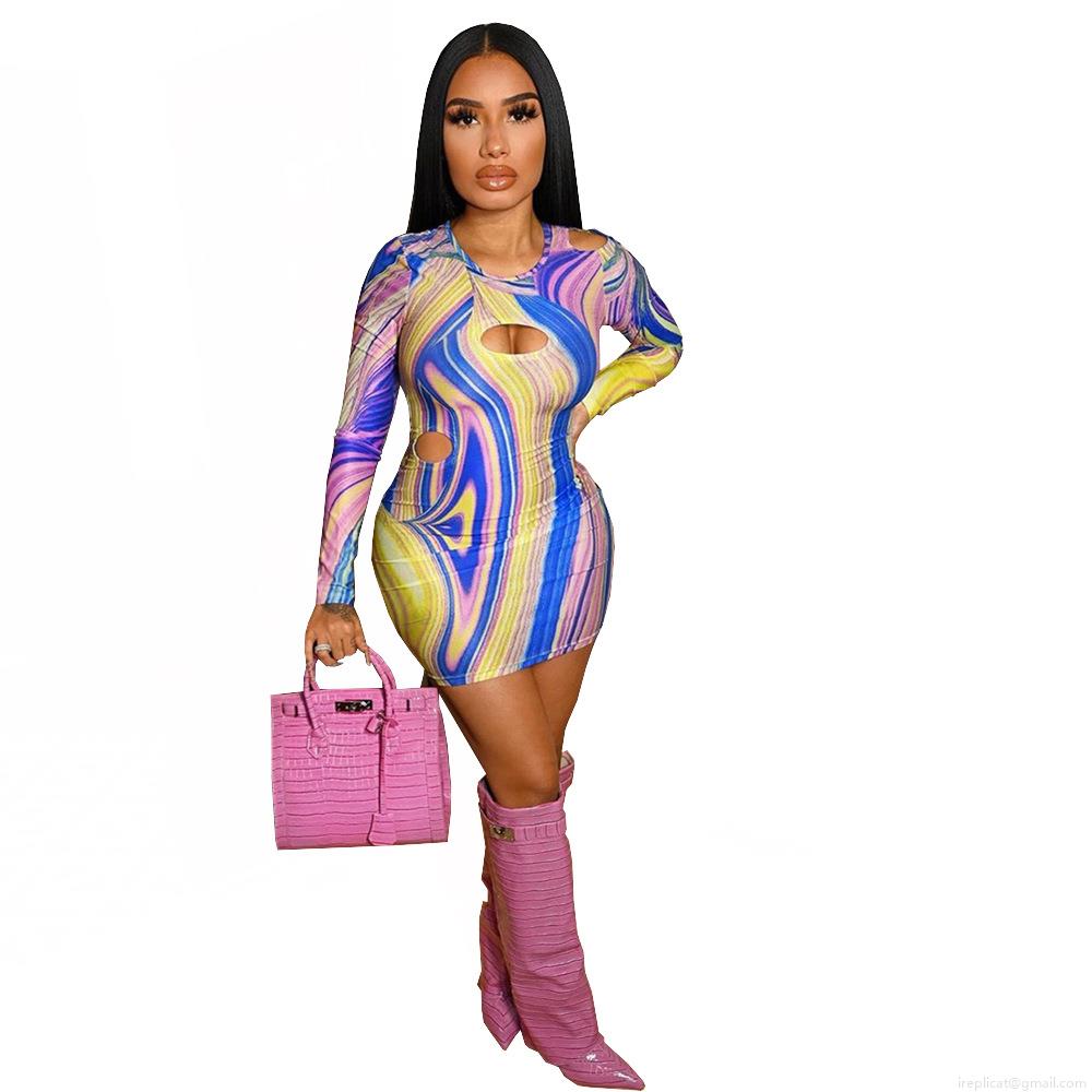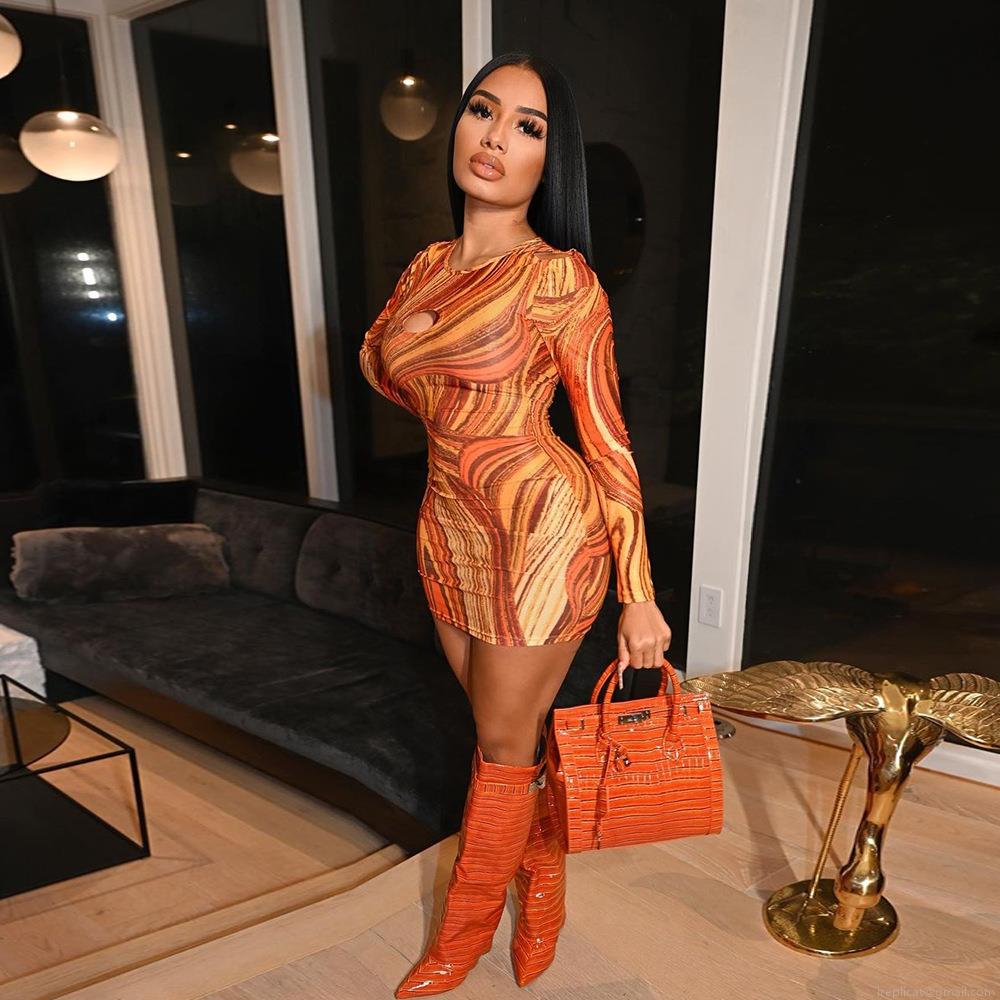 Women's Sexy Hollow Out Long Sleeve Mini Dress Polyester Spandex Abstract Marble Wave Print Bodycon Party Club Streetwear Dress
