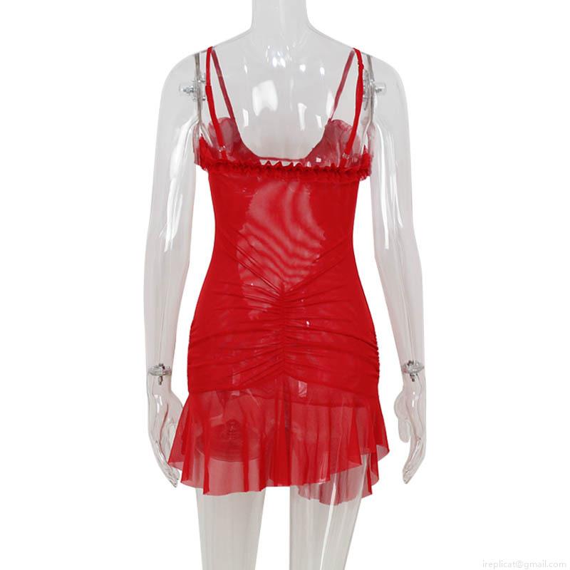 • Women's Sexy Hollow Out Red Mini Dress Spaghetti Strap Ruffle Nightclub Party Bodycon Summer Cami Dress For Women