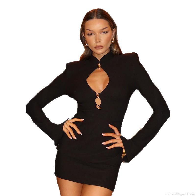 Women's Sexy Hollow Out Stand Collar Long Sleeve Bodycon Mini Dress Stretchy Polyester Fabric With Decorative Gold Buttons Elegant Party Night Club Evening Dress