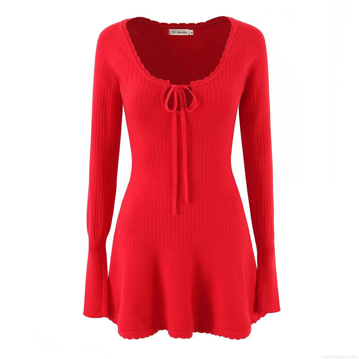 • Women's Sexy Knit Mini Dress Scalloped Edge Tie-up Front Long Sleeve Ribbed Bodycon Autumn Dress for Party Dating Clubwear